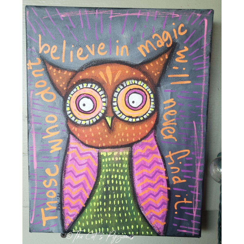 Mixed media painting of a brightly colored owl. Painted on an 8x10" stretched canvas using a combination of acrylics, oil pastels, charcoal, colored pencils, and watercolors.