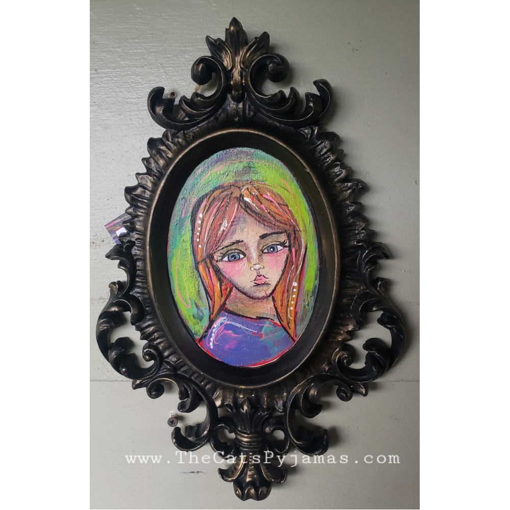 Mixed media painting on wood in an ornate distressed frame. Measures just under 14" tall x 9".