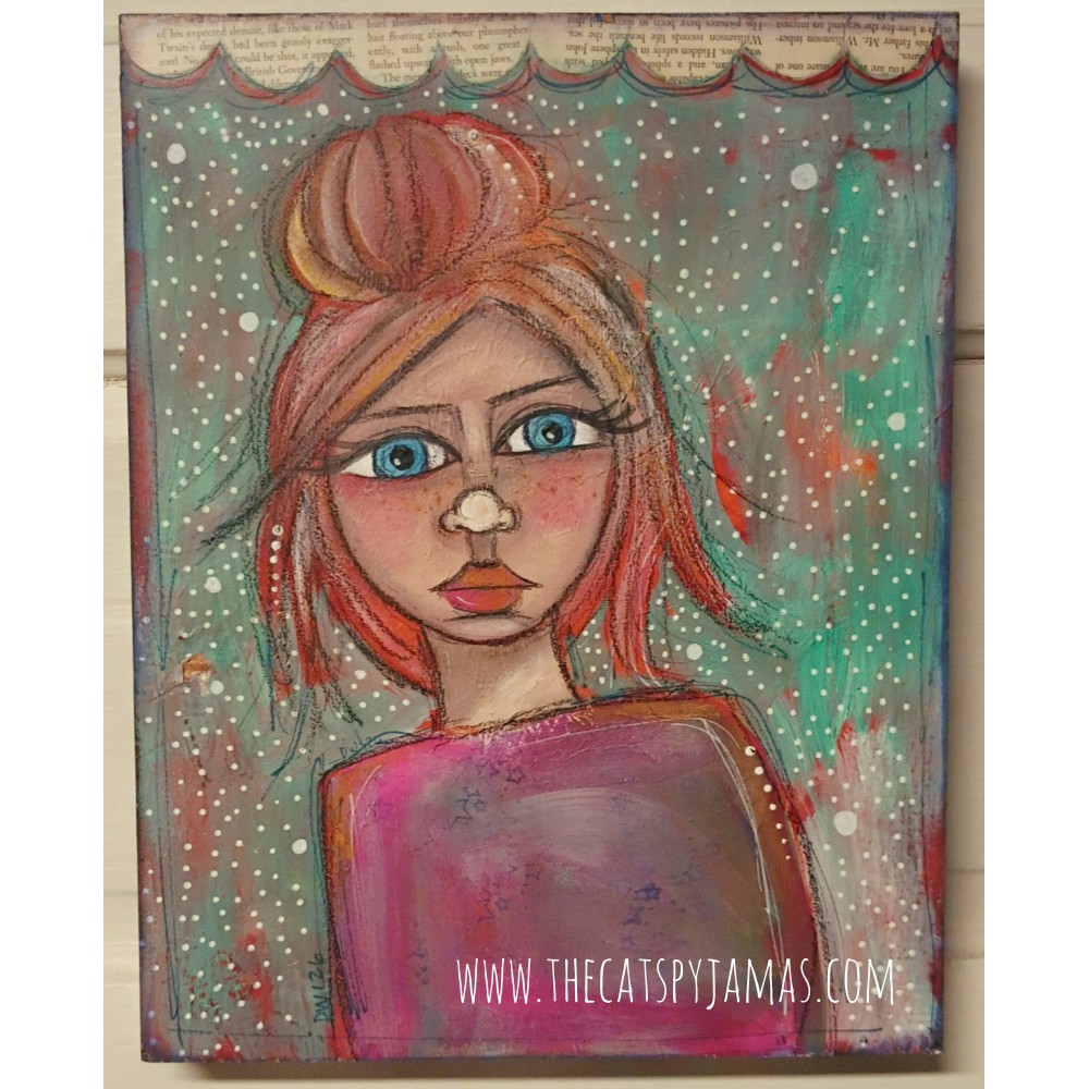 There's a lot going on here! I painted this wooden canvas in a gray/black/white mottled pattern with blue and yellow stars. There's a border of vintage paper at the top and Frances really stands out on these colors! I love her bright red hair, big green eyes and colorful dress! Measures 14.5" x 11.25" x 1.5". I used a combination of acrylic paints, vintage book pages, oil pastels, watercolor & colored pencils.