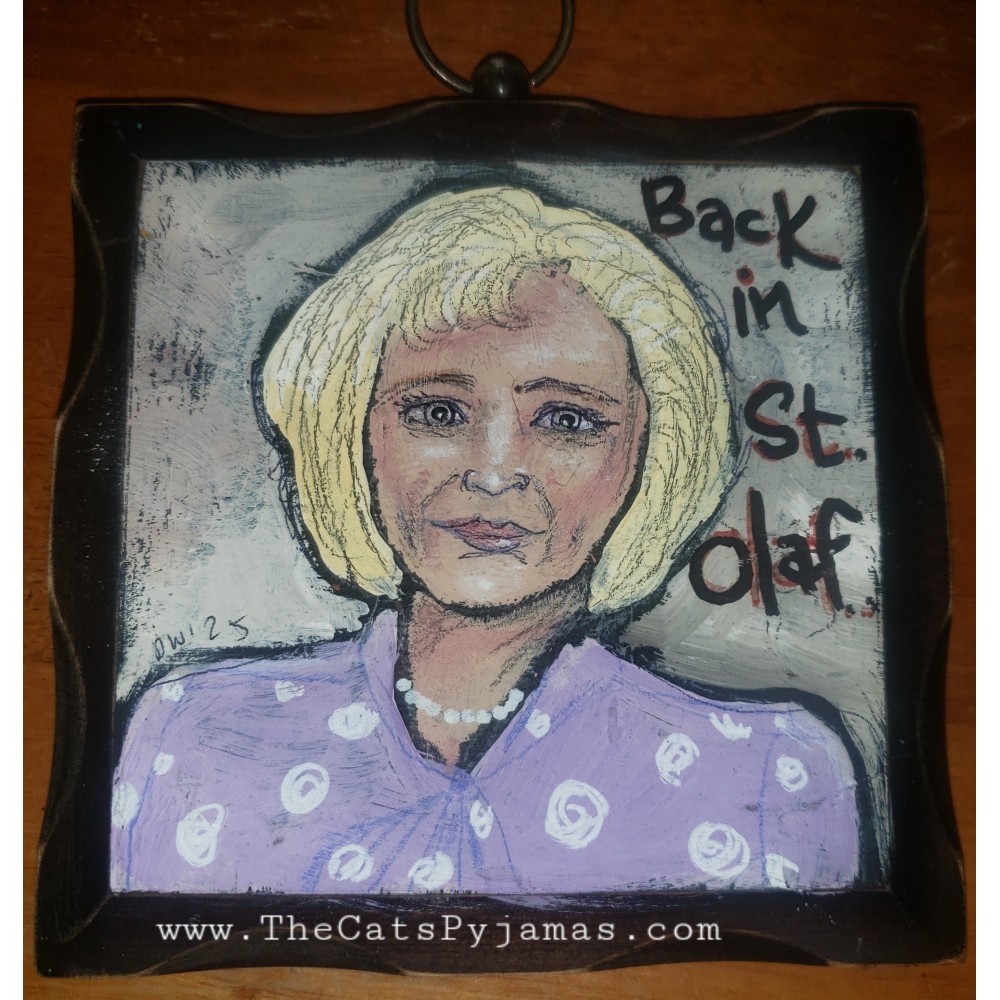 Mixed media painting on an old Home Interior type plaque. It measures 5" x 5" not including the metal hanger. I have 3 more of the other Golden Girls shown in the 2nd photo.