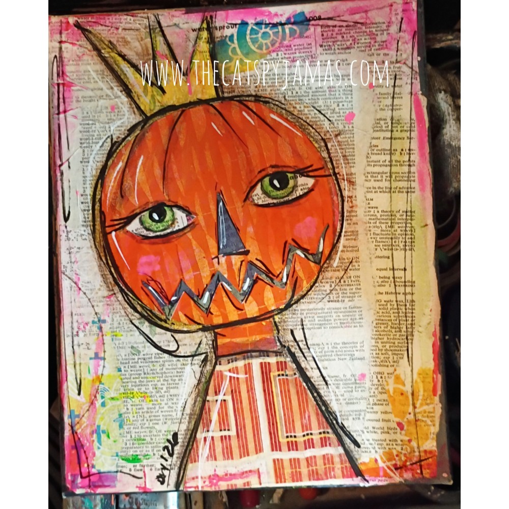 Mixed media painting of pumpkinhead in a crown! Painted on an 8x10" stretched canvas using a combination of acrylics, oil pastels, charcoal, colored pencils, and watercolors.