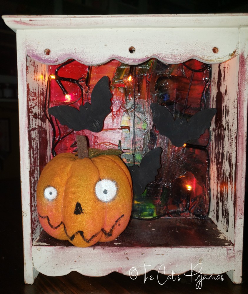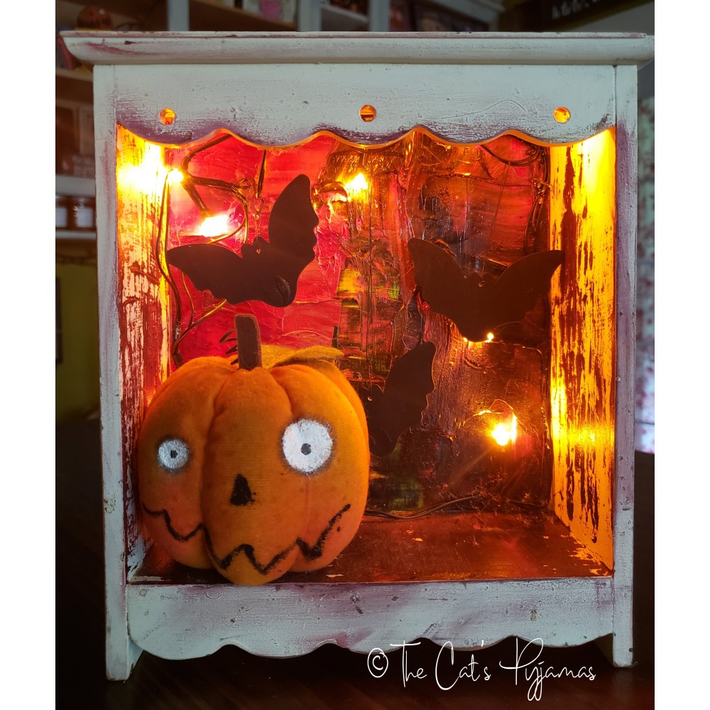 This has been a few years in the making! I painted the wooden box white several years ago, then later painted the inside with oil paints. I'd already painted the jack-o-lantern and recently added him, some painted wooden bats and orange battery-operated lights. Measures 9" tall x 8.25" wide x 3.25" deep.
