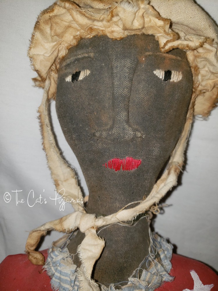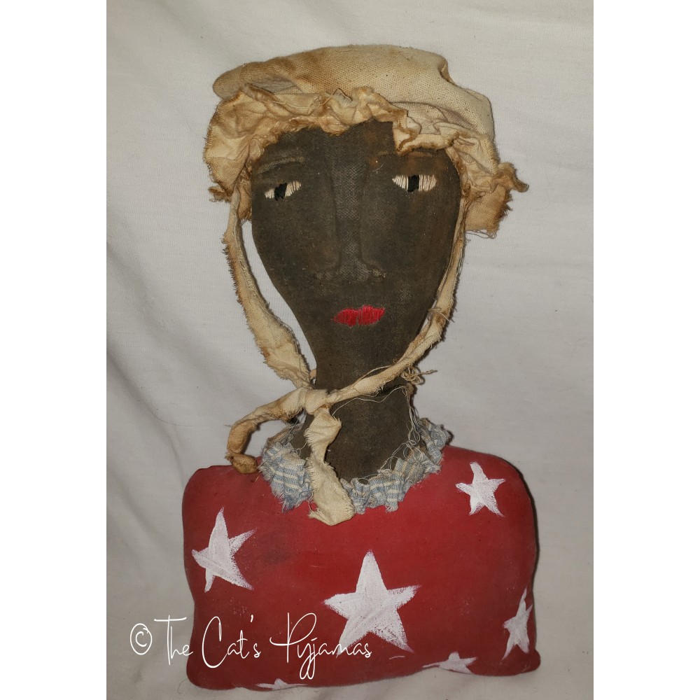 Patriotic shelf sitter made of painted fabric with an antiqued finish. Betsy has a needle sculpted nose and brows, stitched eyes and mouth, and a hat. She's about 13" tall, made from a pattern from Veena's Mercantile.