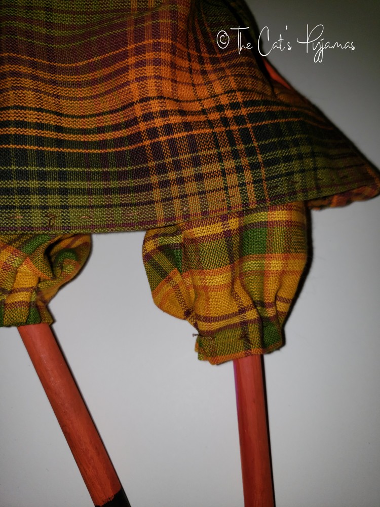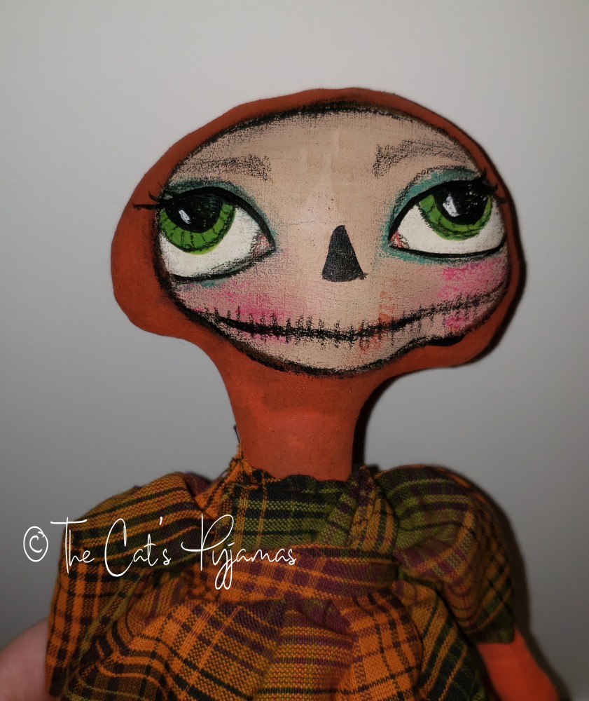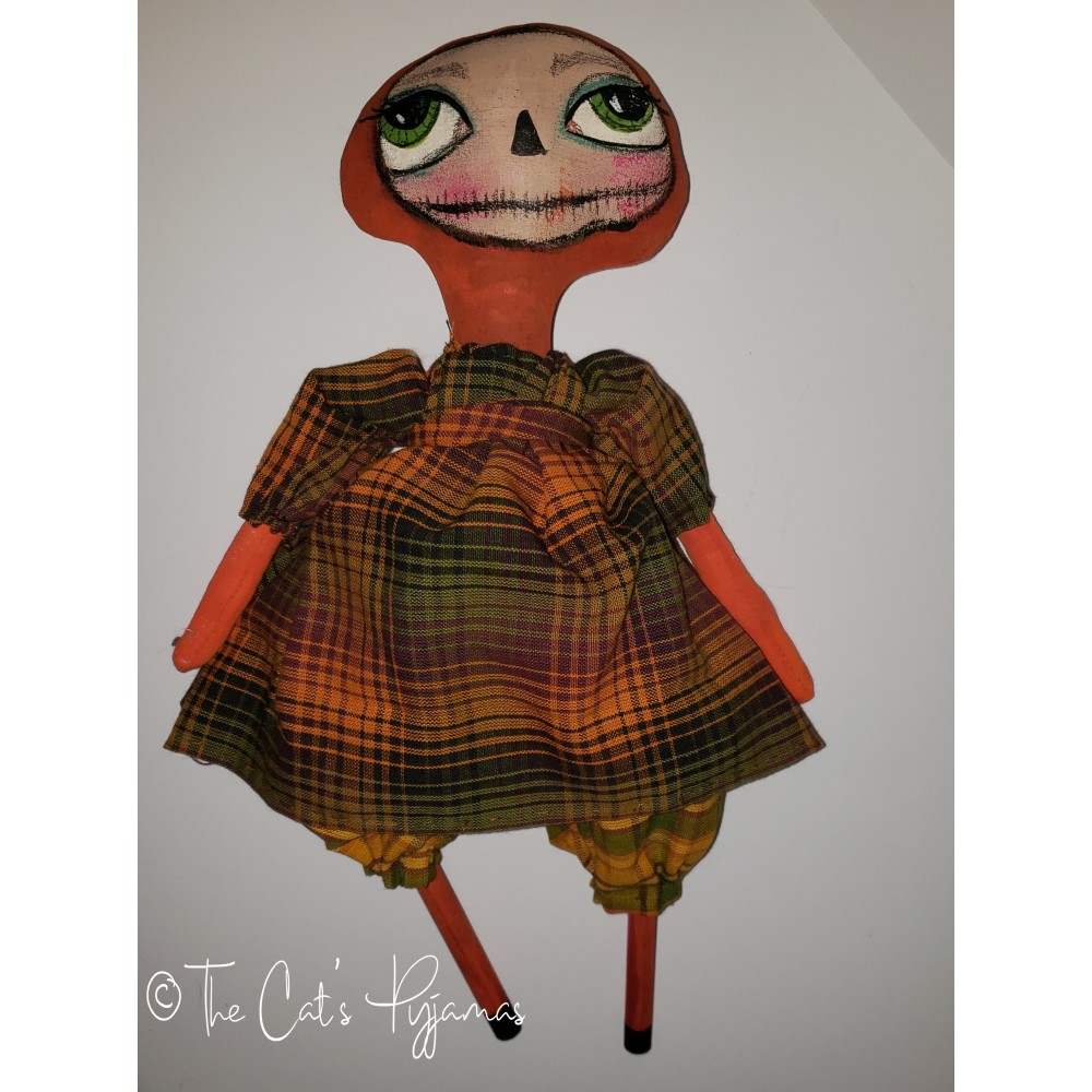 Cloth doll with painted face and wood dowels for legs. Her face is painted using a combination of acrylic paint, oil pastels, watercolors, and colored pencil. Her dress is made of plaid fabric in fall colors with coordinator fall plaid bloomers. She's about 13" tall.