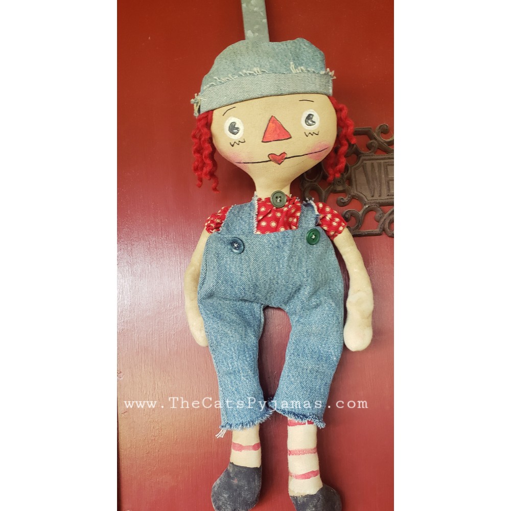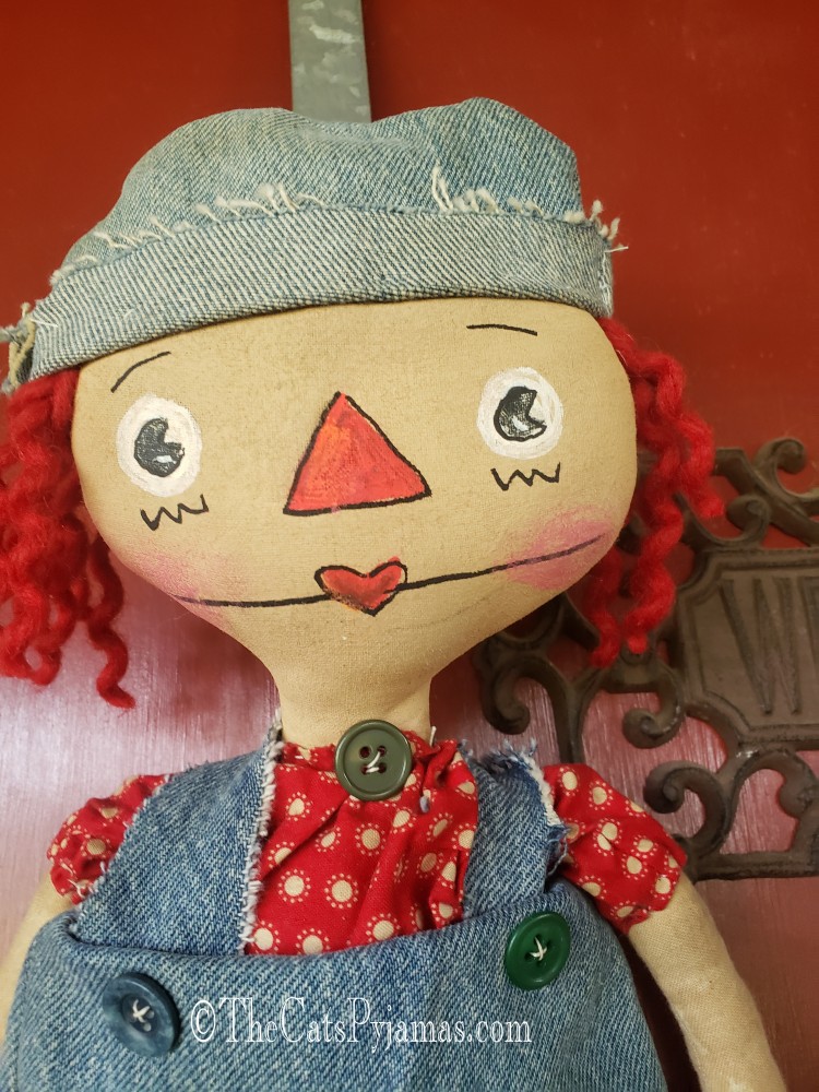 Hand-made cloth doll with hand-painted features and a hat and overalls made from an old pair of jeans. He measures about 17".
