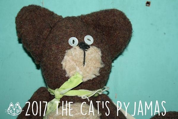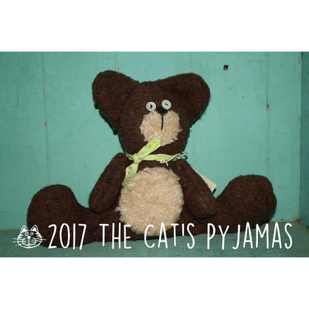 Made from a vintage felted sweater (the perfect teddy bear color, don't you think?). Terry measures about 7½" tall. His arms are moveable, but his legs aren't. Has button eyes and his nose is stitched.