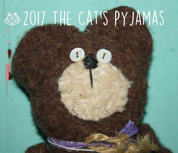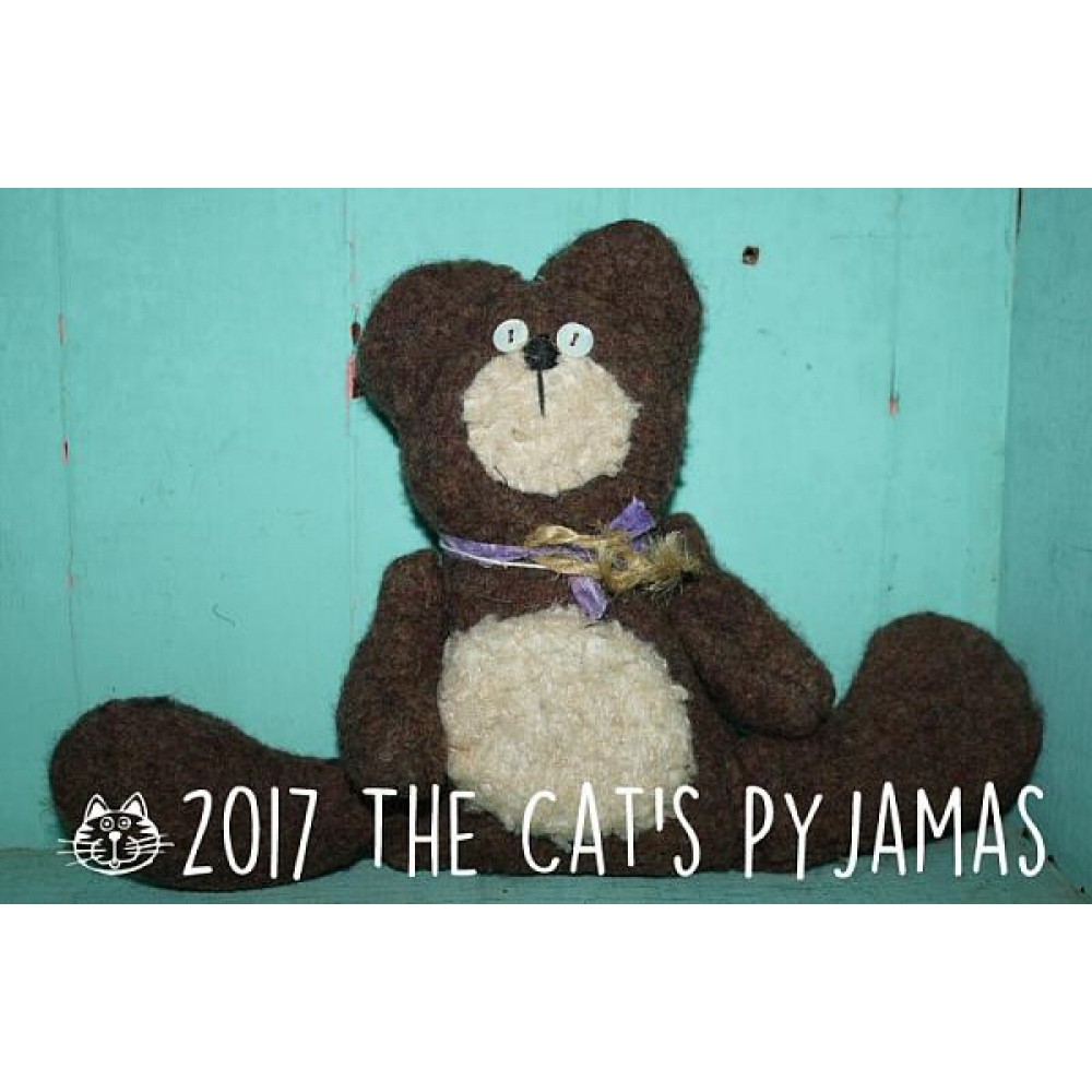 Made from a vintage felted sweater (the perfect teddy bear color, don't you think?). Terry measures about 7½" tall. His arms are moveable, but his legs aren't. Has button eyes and his nose is stitched.