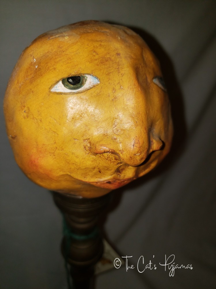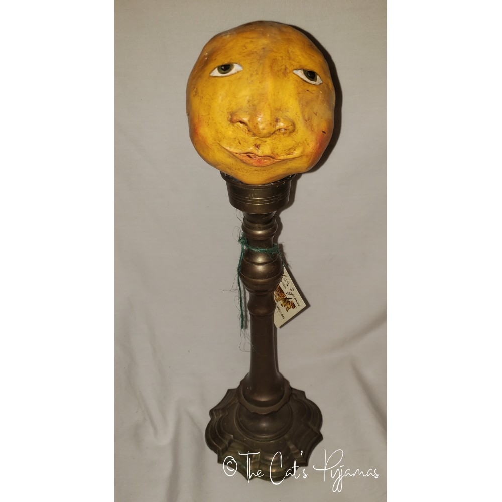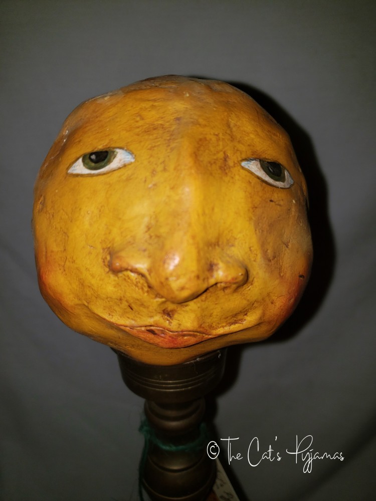 I sculpted the head from paperclay and painted it, mounted on a big, heavy candlestick. Stands about 17" tall.