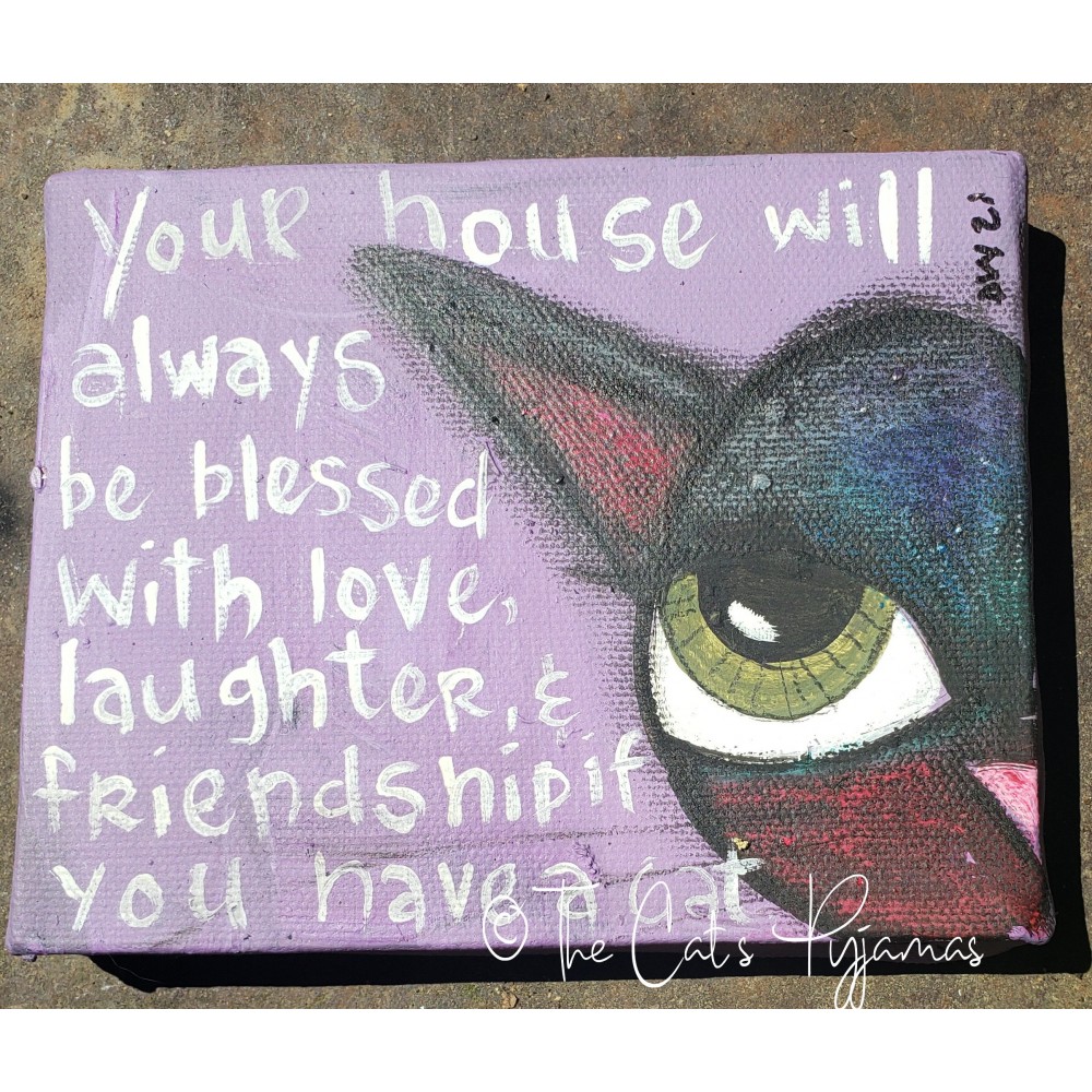 I used a combination of acrylics, oil pastels, watercolors, colored pencil and ink and hand-lettered the words, "Your house will always be blessed with love, laughter, and friendship if you have a cat." - Lewis Carroll