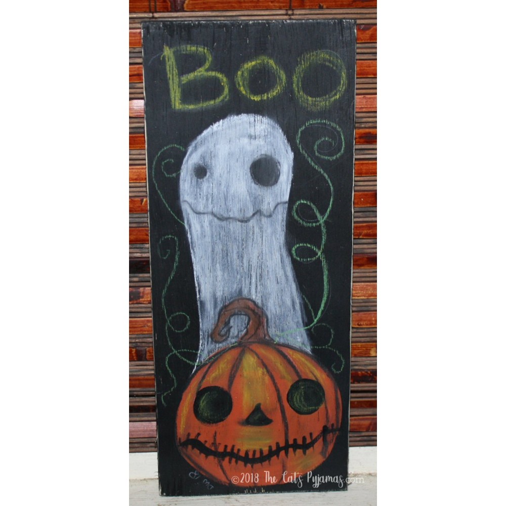 Really fun ghost and jack-o-lantern painted on a piece of reclaimed plywood. I painted it black and distressed it a little, then added the ghost & pumpkin using acrylic paints, oil pastels, watercolors and colored pencils. It has a hanger on back and measures 12" tall x 5" wide.