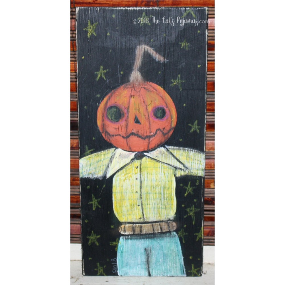 Leo is a pumpkin head/Scarecrow I painted and I haven't decided if he is cute or just creepy. He's painted on a piece of reclaimed plywood. I painted it black and distressed it a little, then added the Scarecrow using acrylic paints, oil pastels, watercolors and colored pencils. It has a hanger on back and measures 10.5" tall x 4.75" wide.
