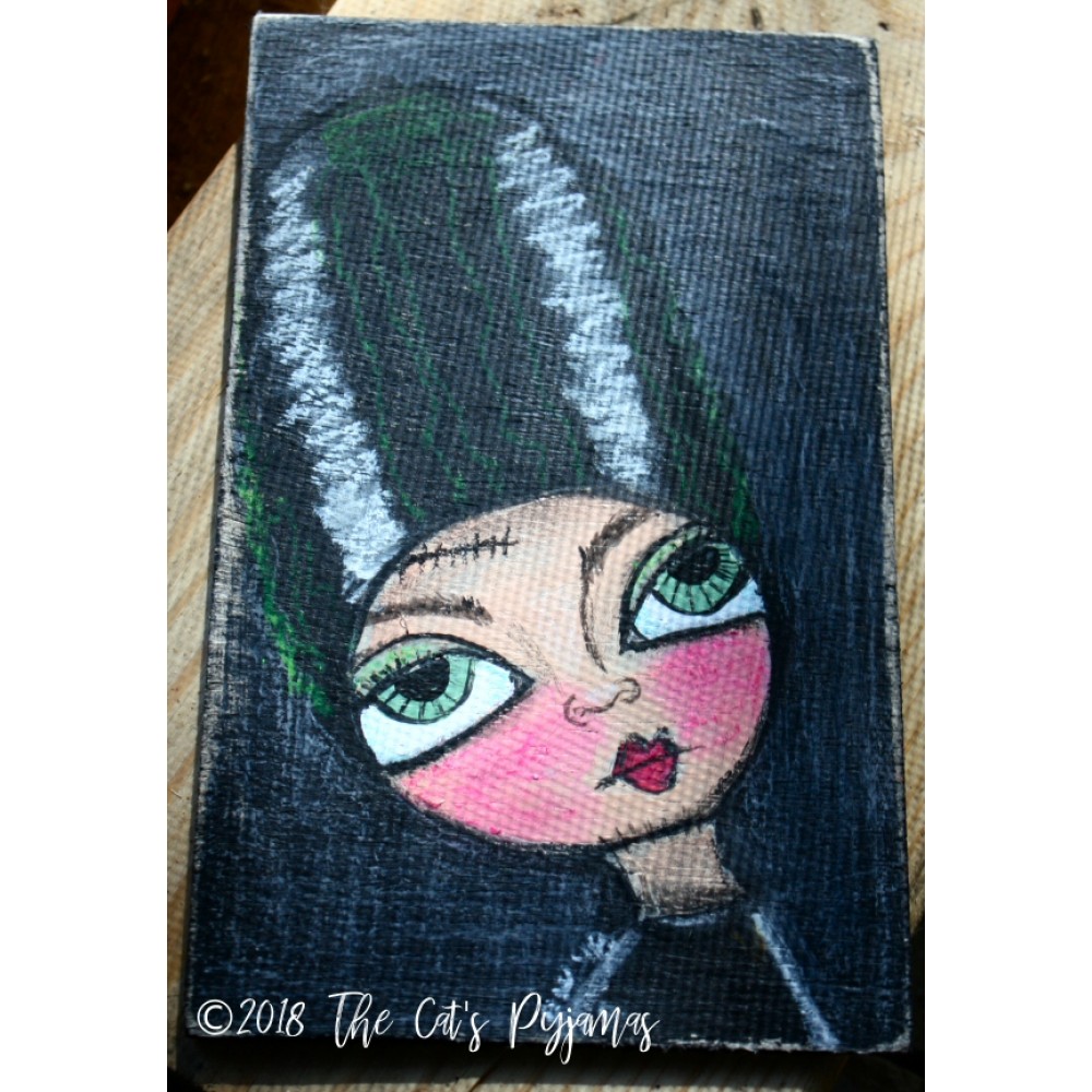 My version of Frankenstein's bride! She's painted on a piece of upcycled plywood with a hanger on the back using a combination or acrylic paints, watercolors, oil pastels and colored pencil and I used lots of bright colors.