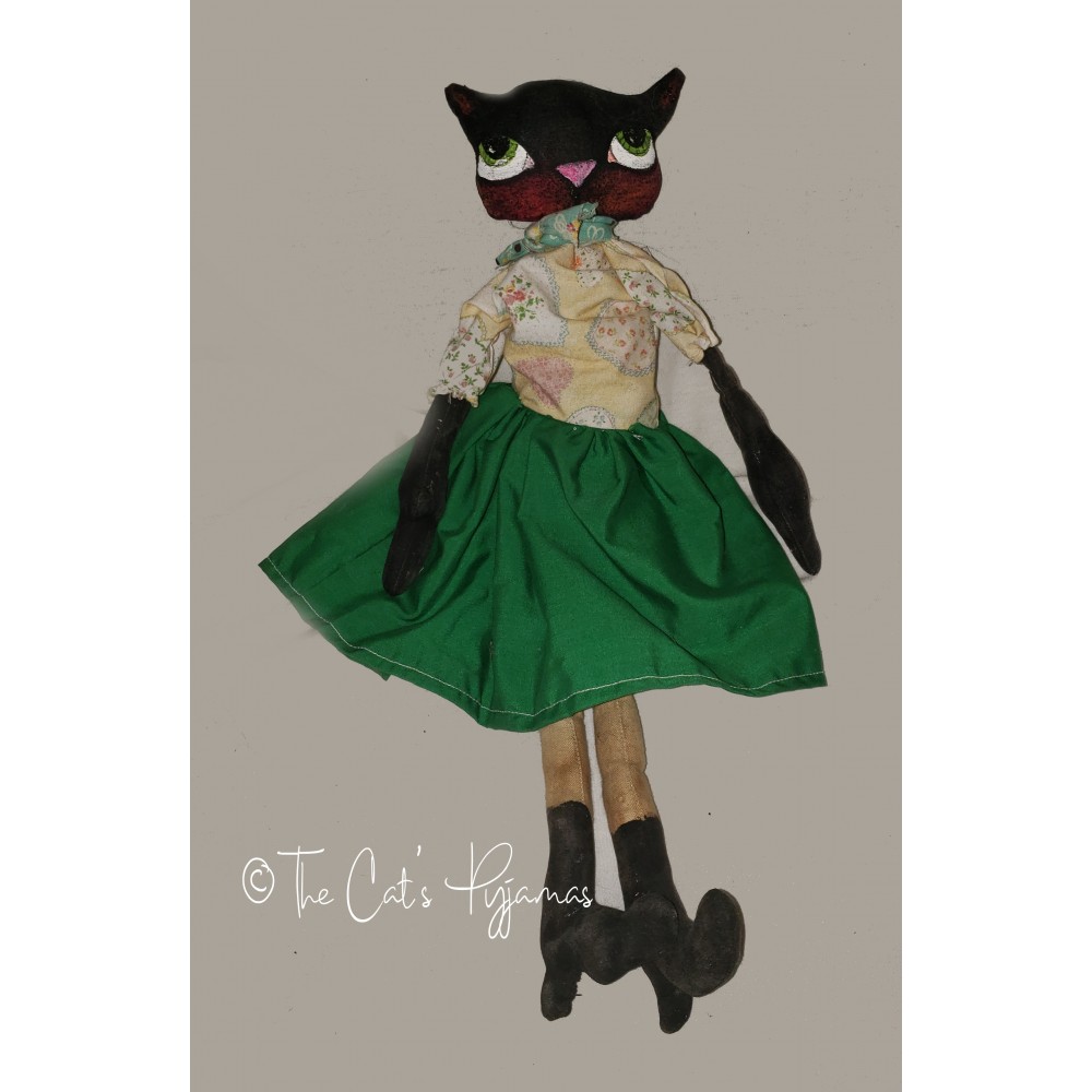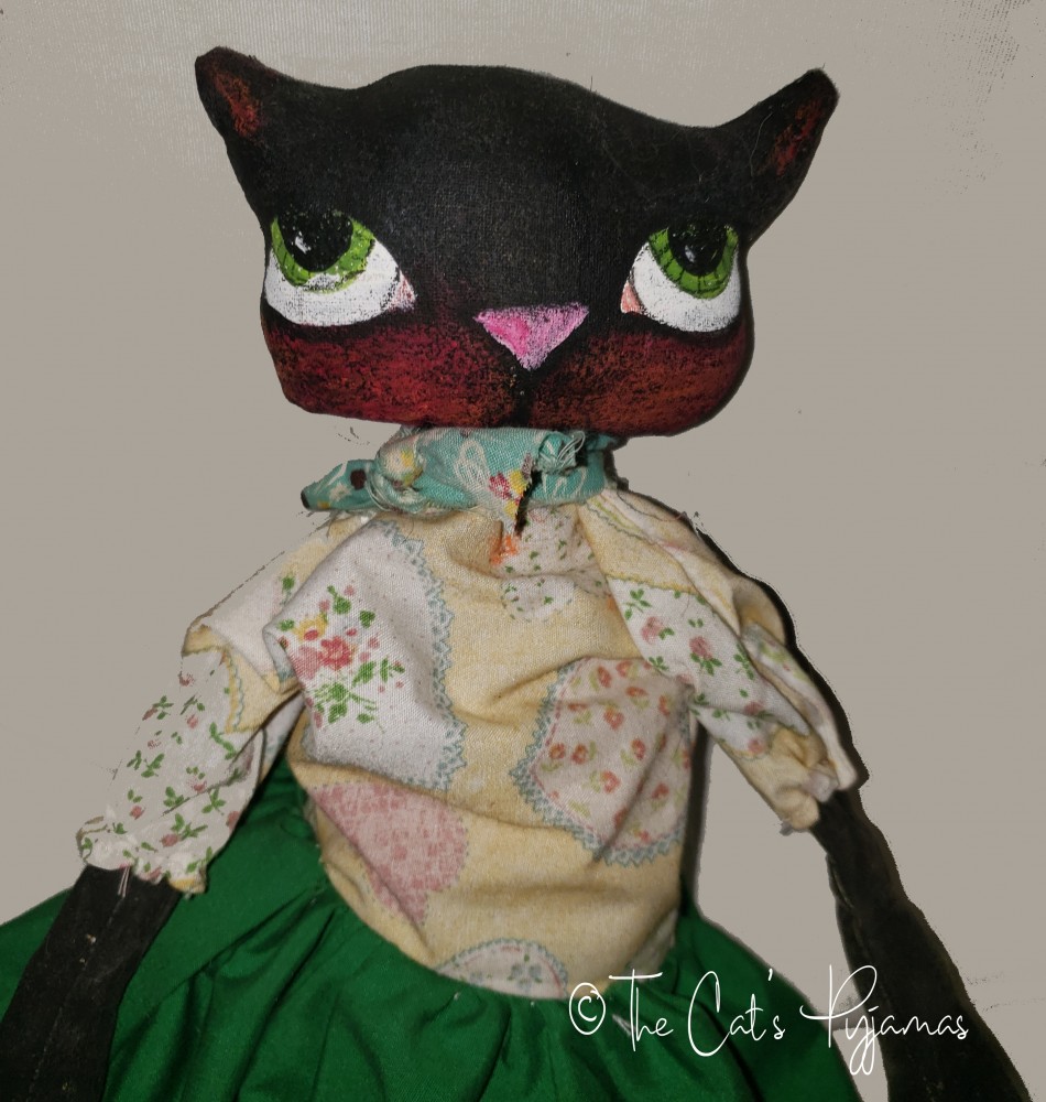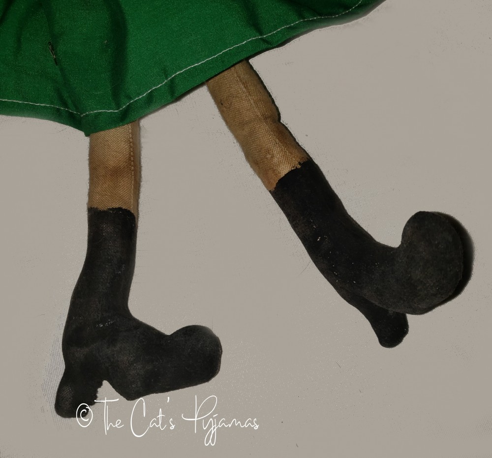 Made of painted fabric with big painted eyes, a little over 18" tall.