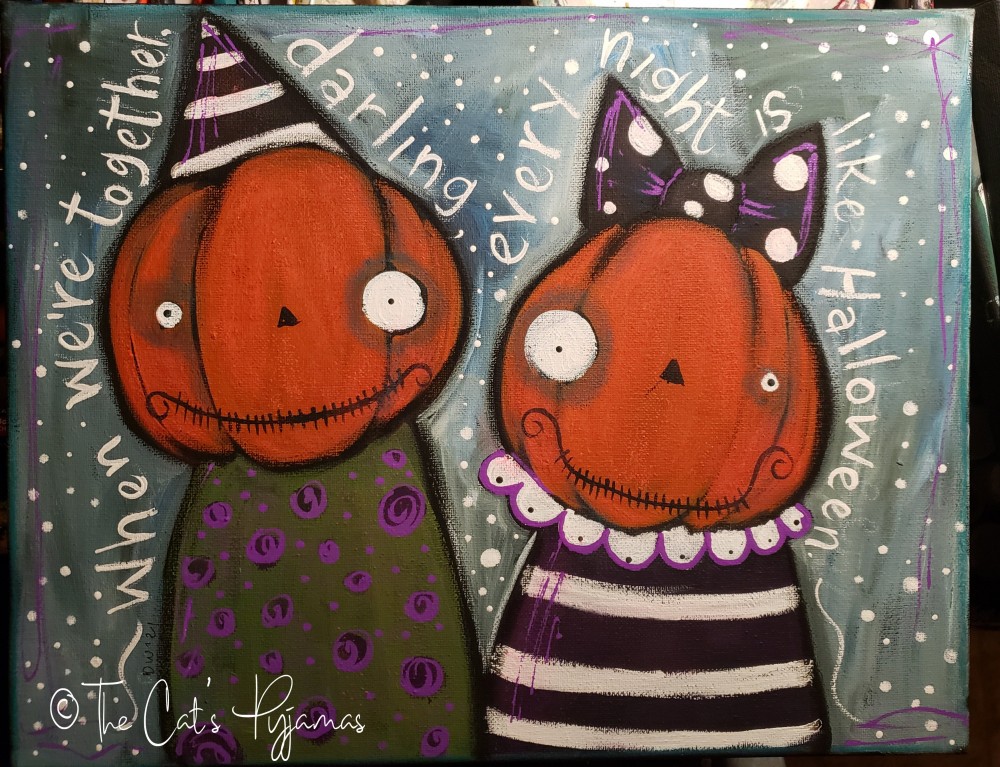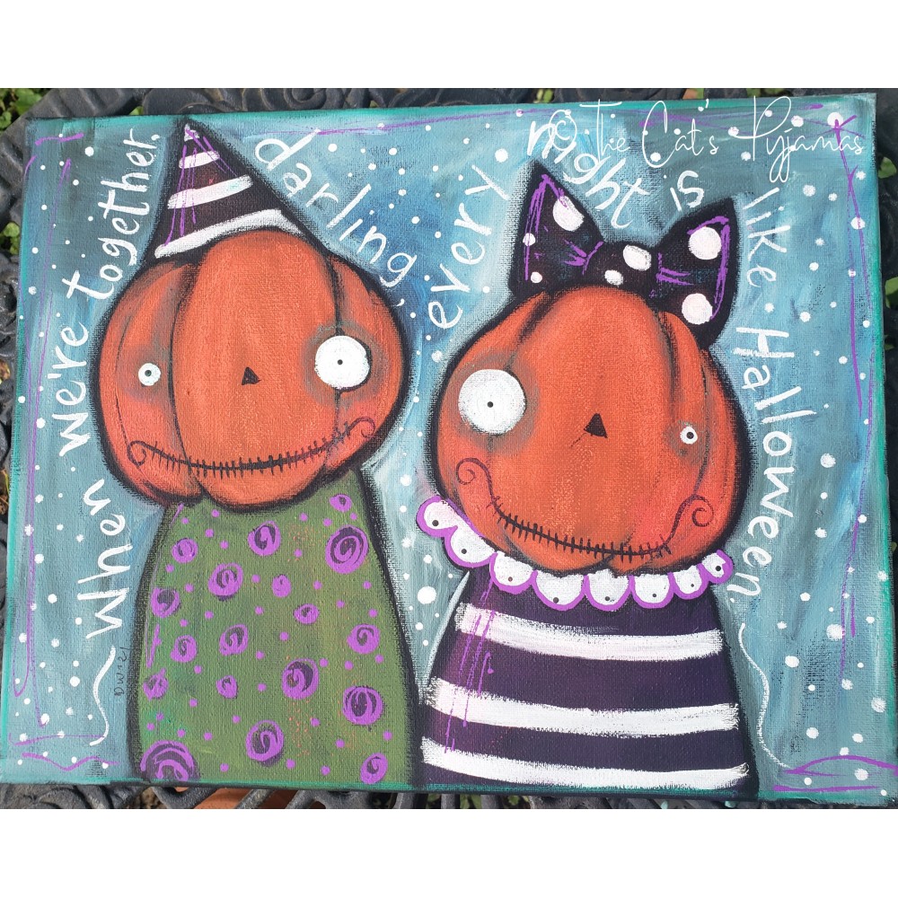 Painted on an 11" x 14" stretched canvas using a combination of acrylics, watercolors, colored pencil, and oil pastels. I painted acute Jack-o-lantern couple and hand-lettered the quote, "When we're together, darling, every night is like Halloween." - Morticia Addams