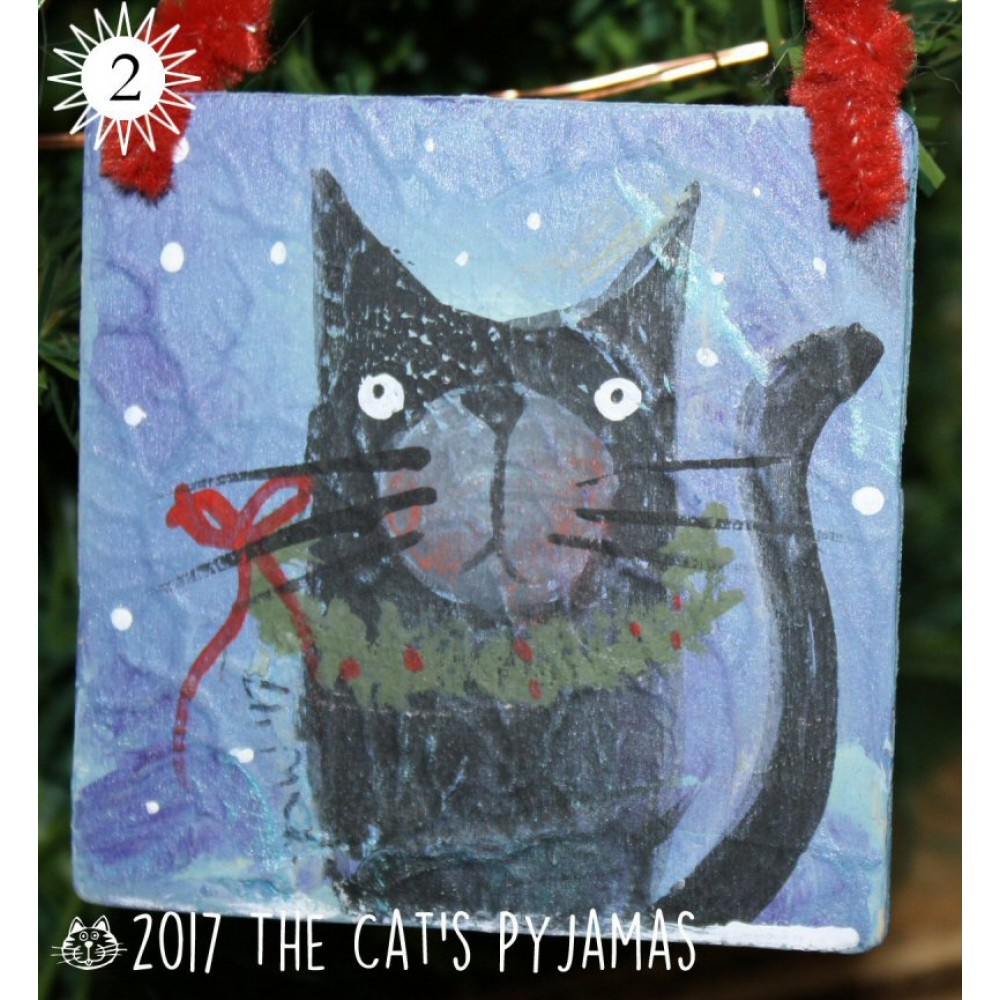 Hand-painted ornament on wood with a vintage pipe cleaner hanger. 3" x 3"