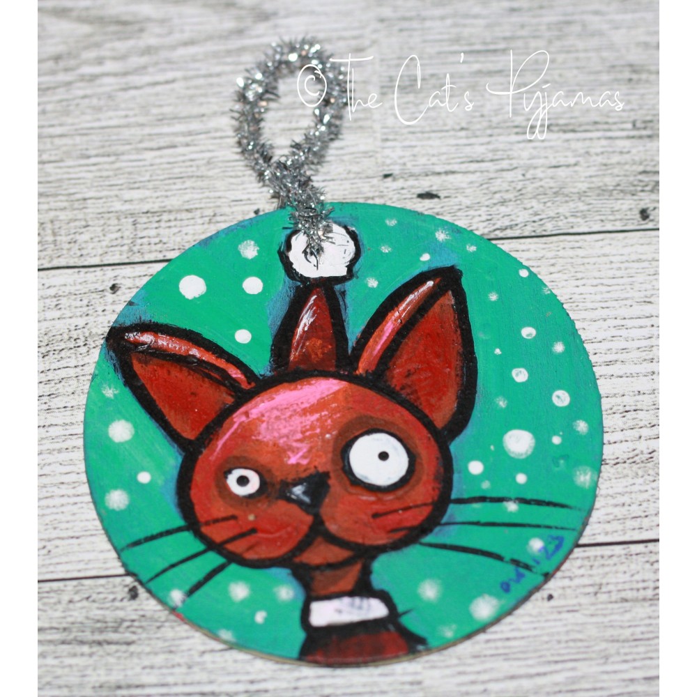 Measures a little over 3" across, painted on a wooden ornament with a sparkly hanger