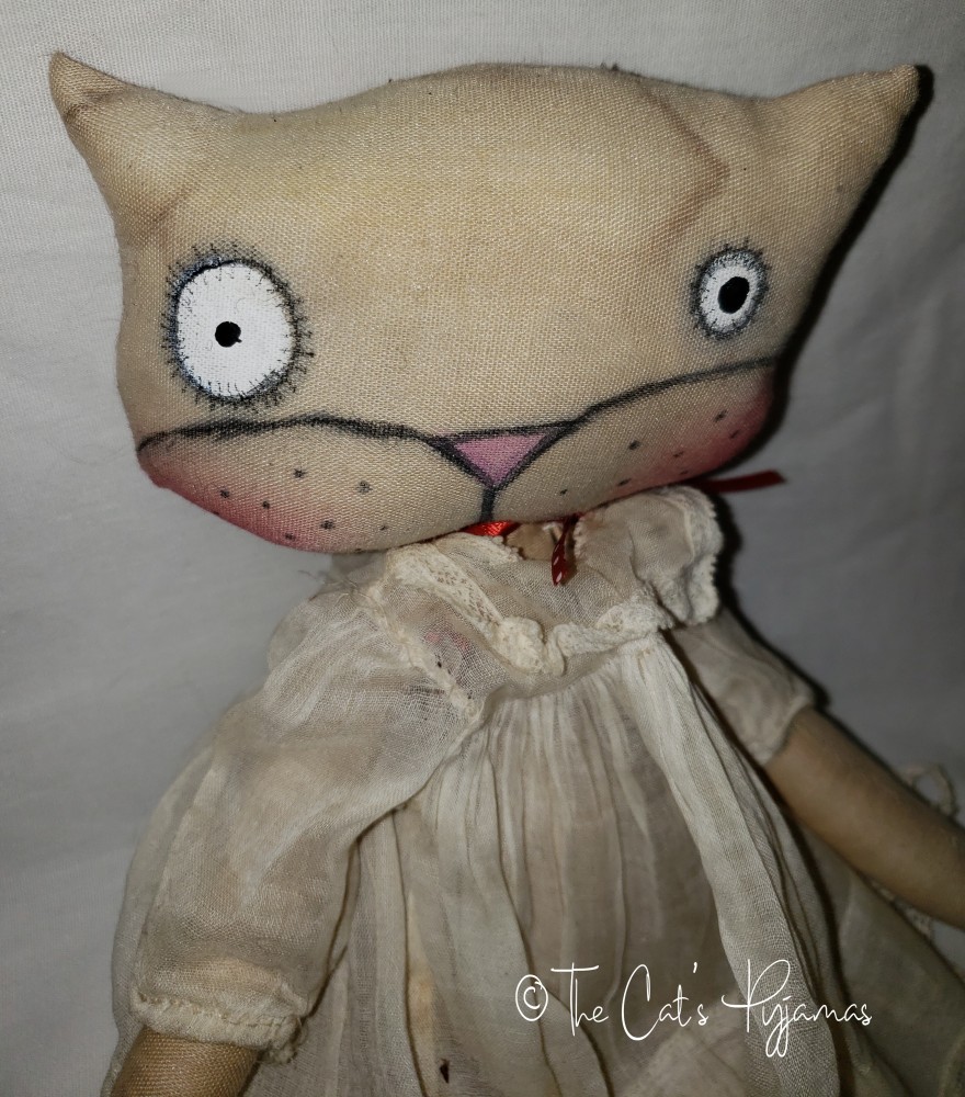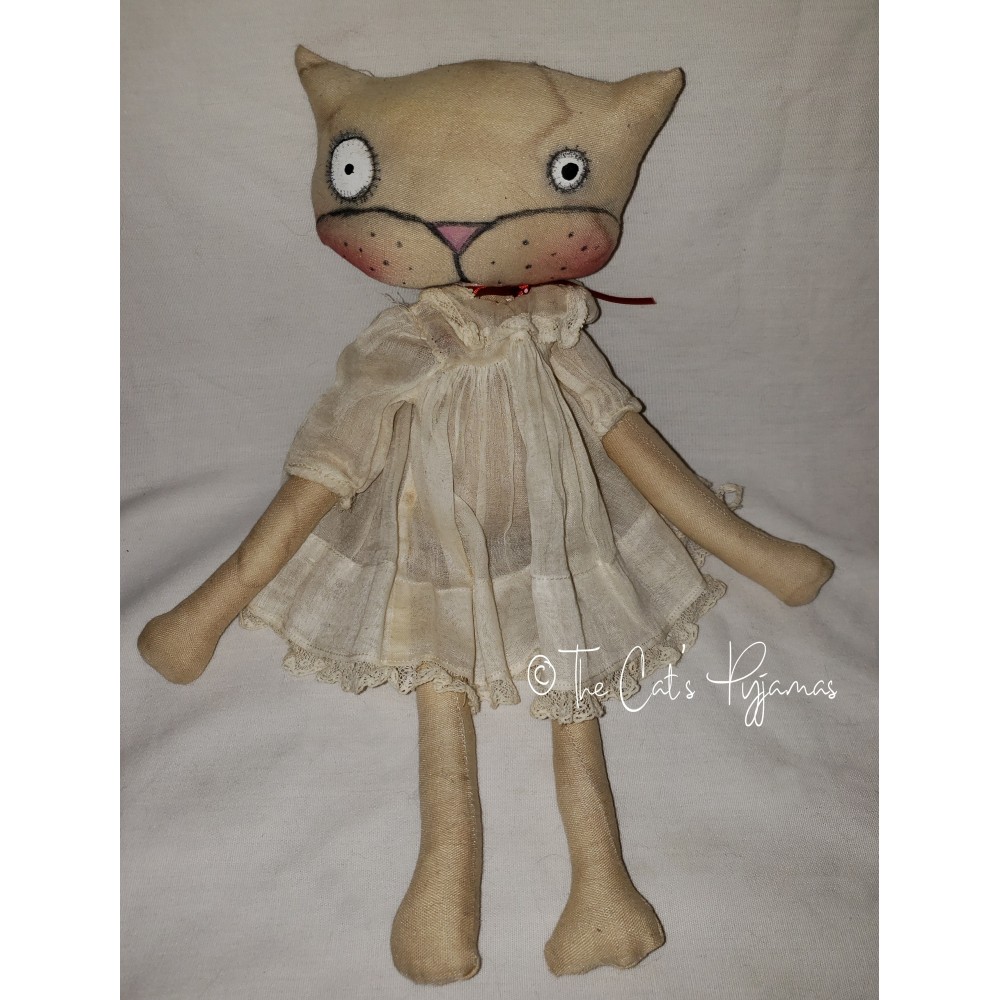 Hand-made kitty doll with hand-painted features. She's wearing a vintage white, lacy dress and is about 13" tall.