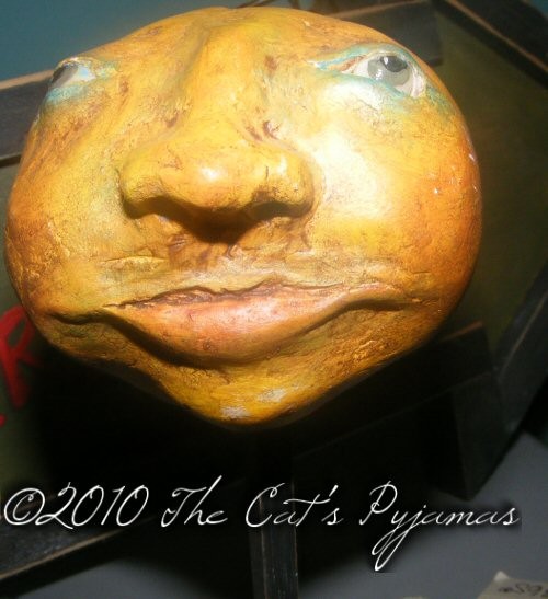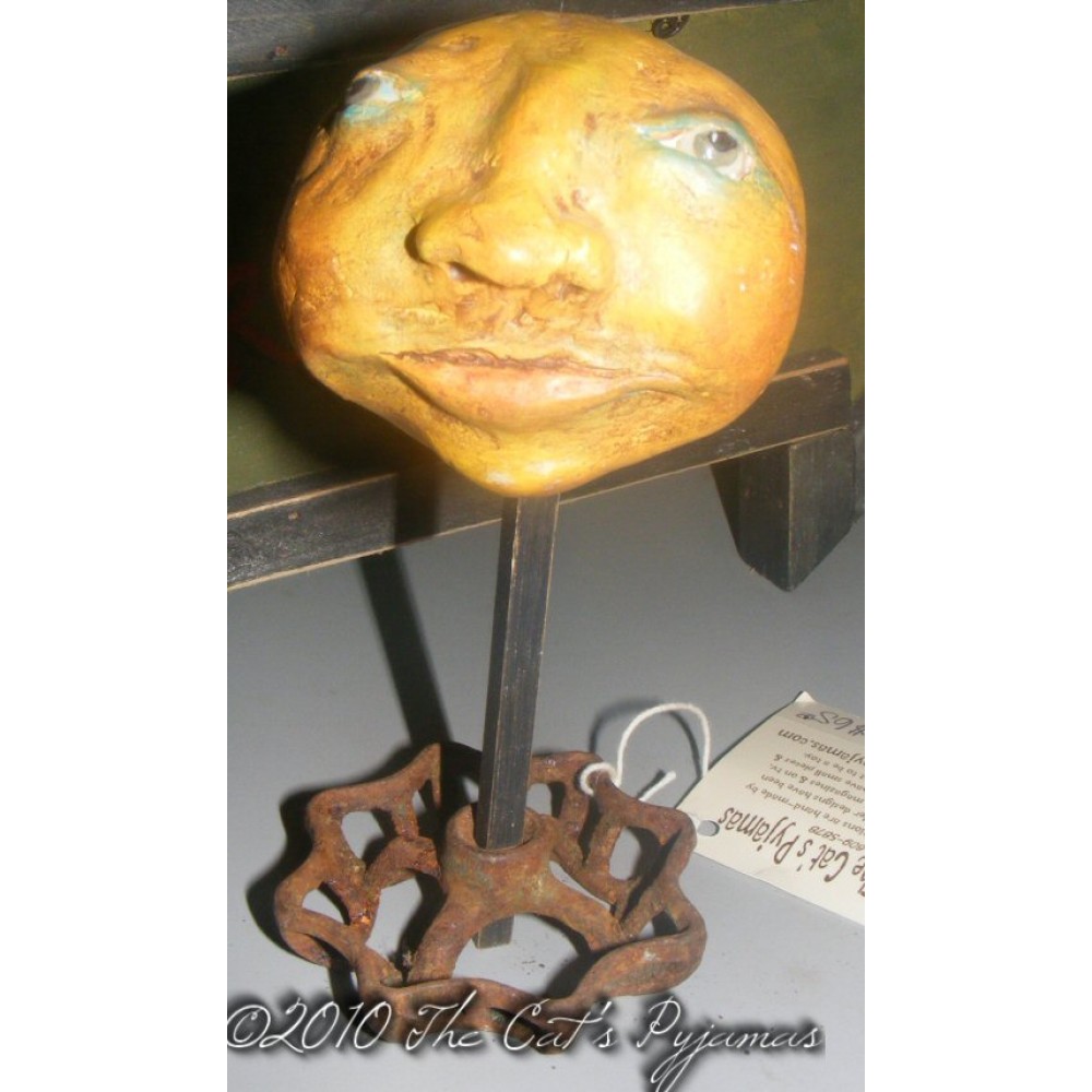 Moon head is hand-sculpted from paperclay. I sculpted his eyes for a harder clay and sculpted the eyelids over that. I painted the moon several different layers of paint with many different colors and a very slight crackle effect. The base of the make-do is a rusty old handle and a painted & distressed wooden dowel.