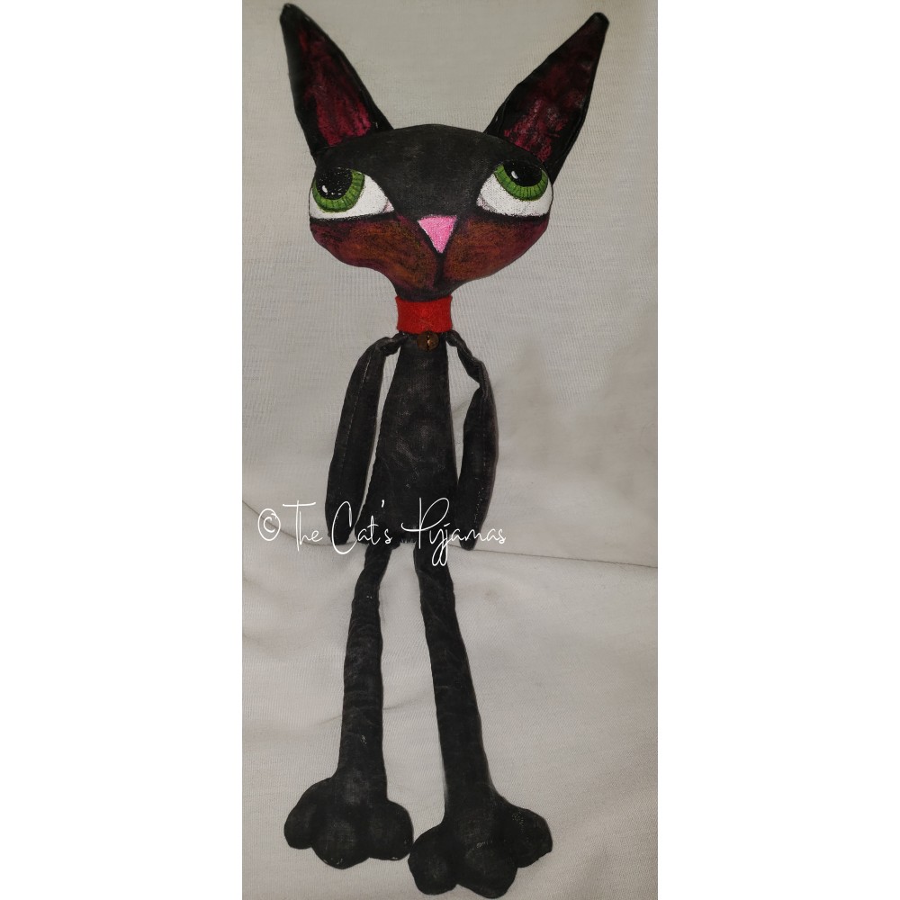 Black cat doll made of painted fabric with big blue eyes, a red felt collar, and a rusty bell. He's about 15.5" tall.