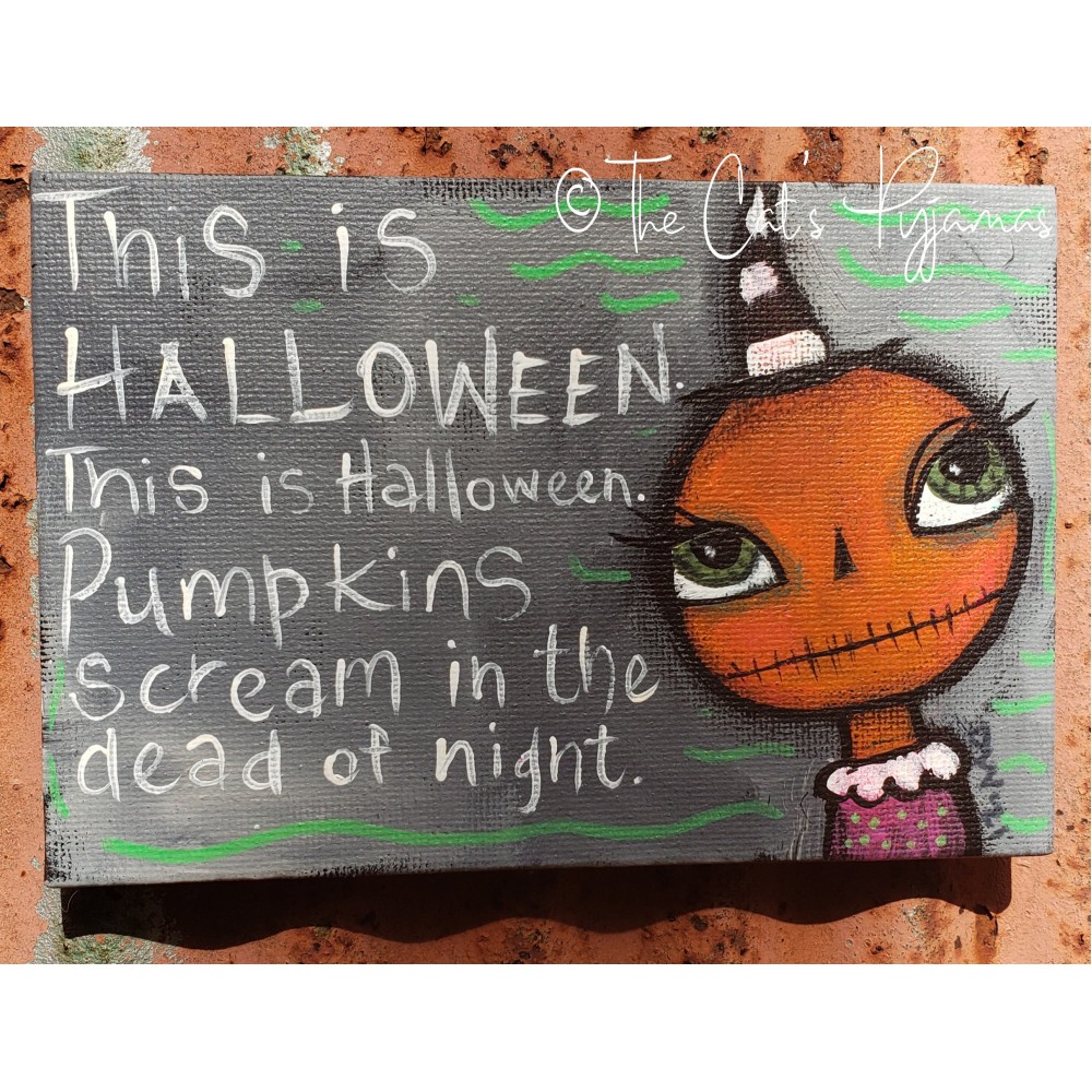 Mixed media painting of a pumpkinhead in a witch hat. I added some Nightmare Before Christmas lyrics (This is Halloween). Painted on an 4x6" stretched canvas using a combination of acrylics, oil pastels, charcoal, colored pencils, and watercolors.