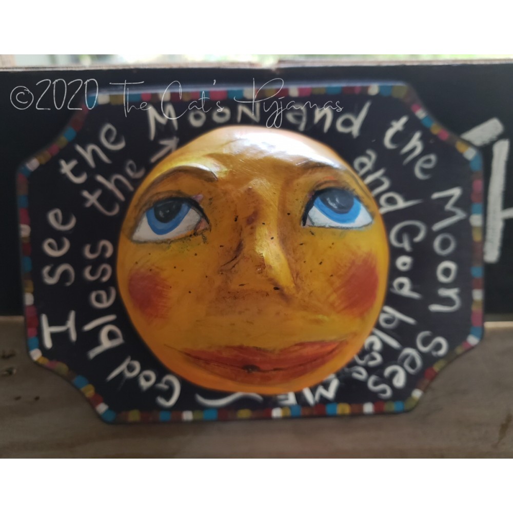 Hand-sculpted and painted moon face on a wooden plaque.