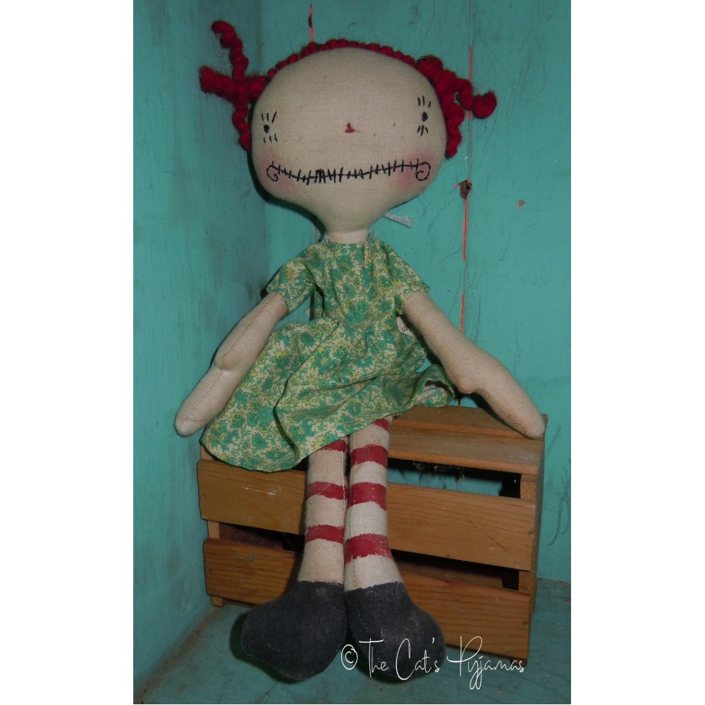 Isadora was featured in Create & Decorate magazine...She was on the cover of the August 2011 edition. She's made from aged fabric with hand-stitched face, painted legs and feet and red wool yarn for hair. She on the smaller side, only 12.5" tall, a good size for tucking on a shelf!