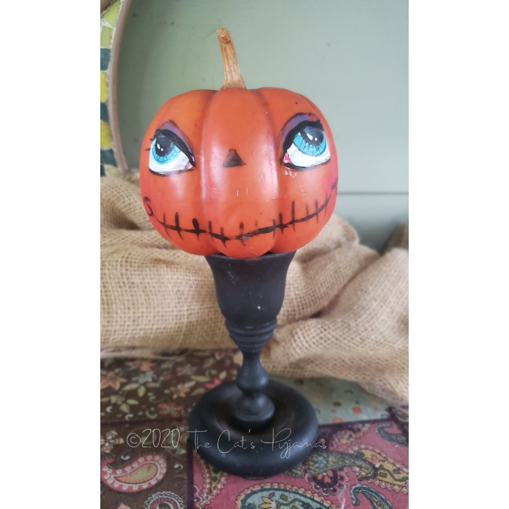 Painted pumpkin head with big eyes and a painted candle holder as a base. About 8.5" tall.
