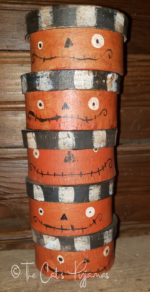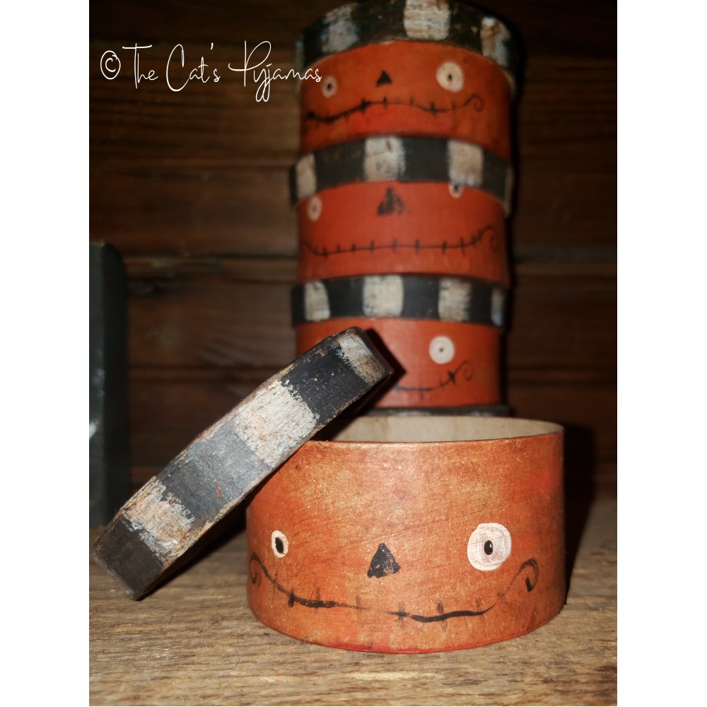 Cute little jack-o-lantern boxes. They're hand-painted and measure just 1.5" tall. They'd make cute little gifts filled with candy for Halloween!