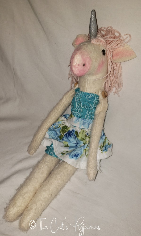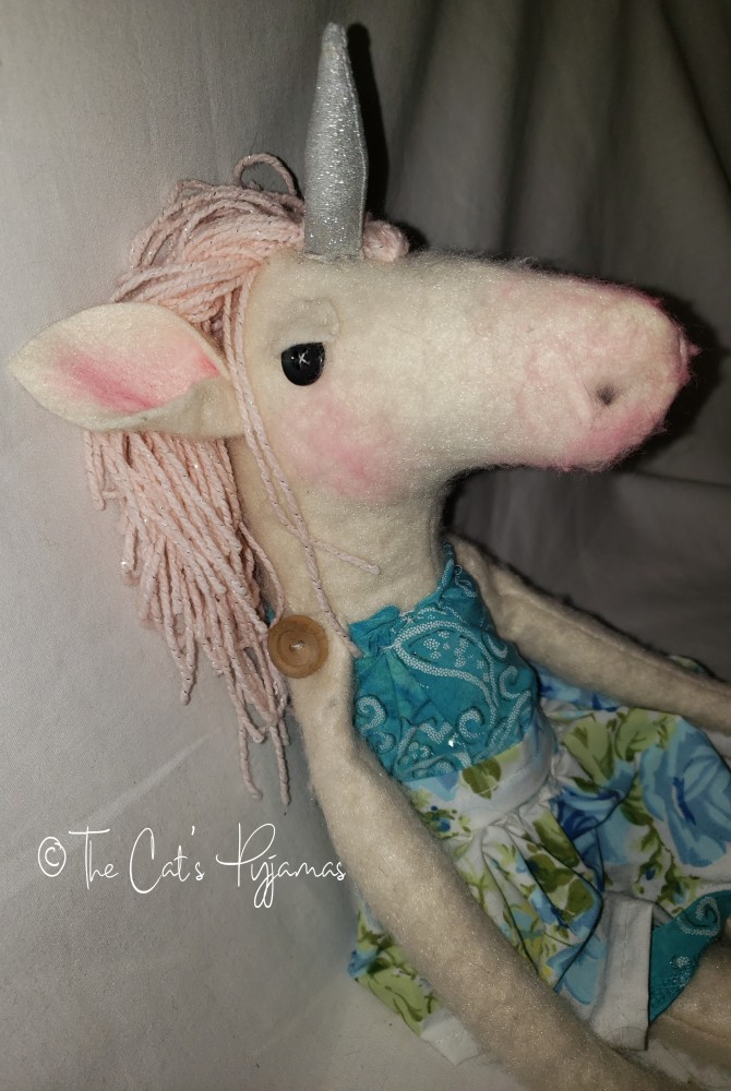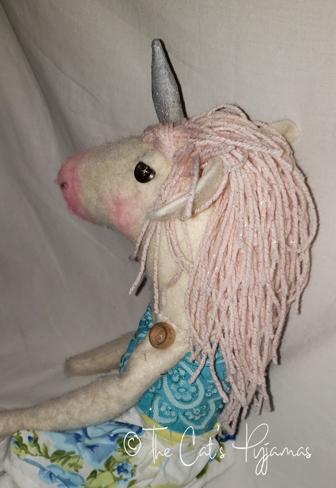 Unicorn doll made of fuzzy off-white fabric with button eyes, eyelids, and a sparkly horn. Her arms are attached with buttons and her hair is made of pink sparkly yarn. Her dress is made from fabrics in blues and teals. She's about 22" tall.