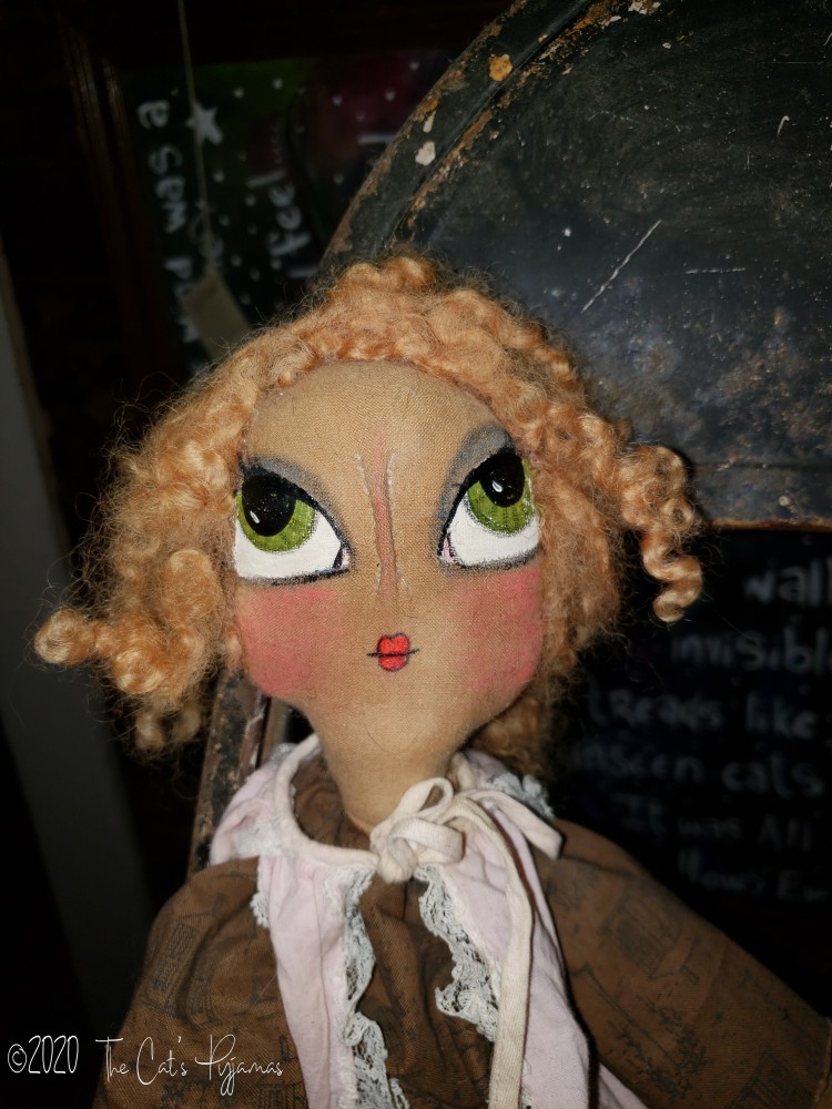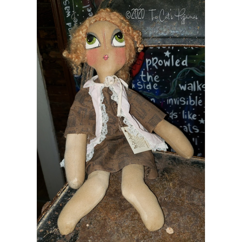 Katie has blonde wool curls and big green eyes! Her dress in some older fabric with salt box houses on it and she's wearing a vintage doll dress over the top. She's about 17.5" tall.