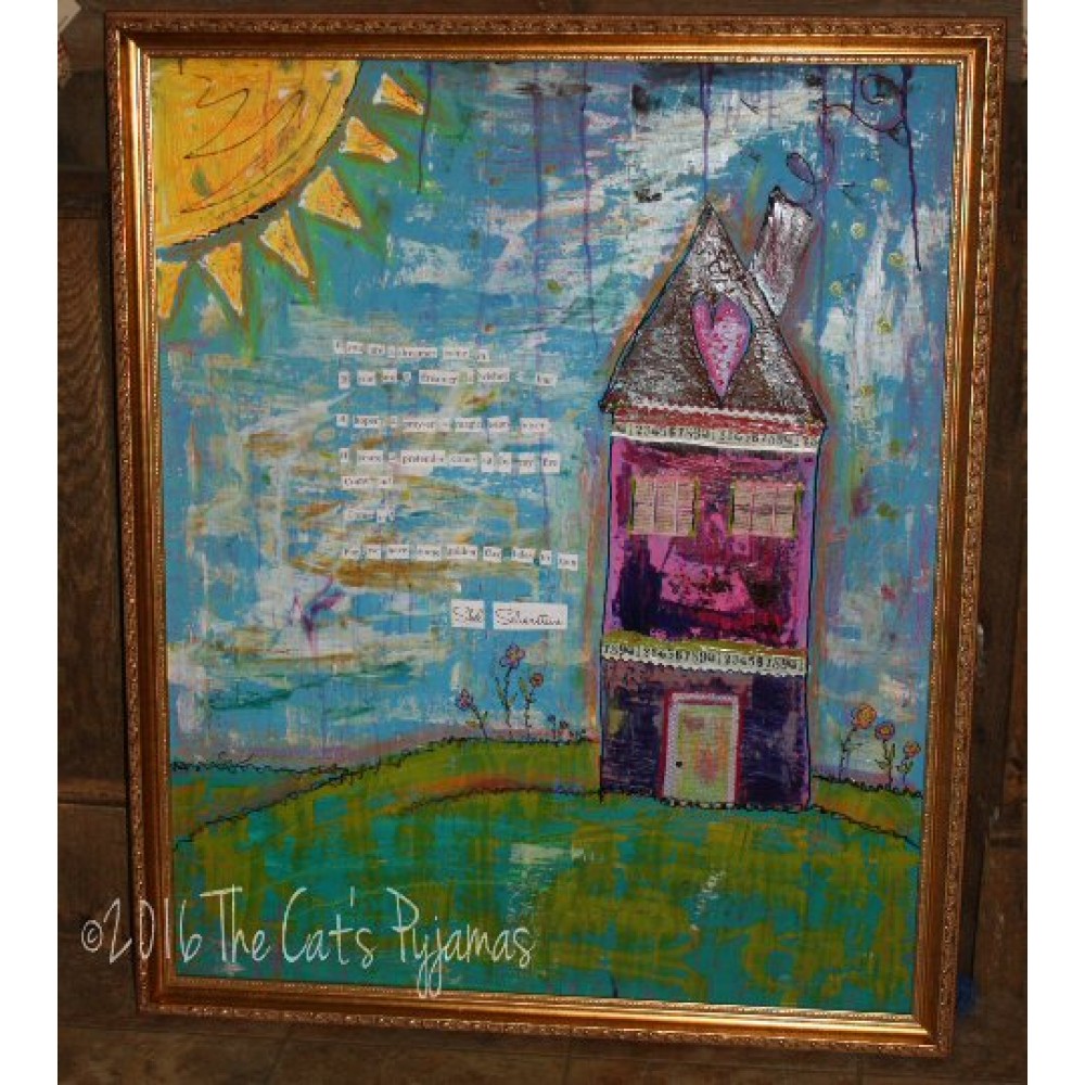 The background has a lot of layers of color with a bright yellow sun and a cozy house sitting on a grassy hill. It has lots of color, texture and different types of things added to it, including papers, acrylic paints, oil pastels, thick paint for more texture, etc. Beside the house, I put a favorite quote of mine by Shel Silverstein: