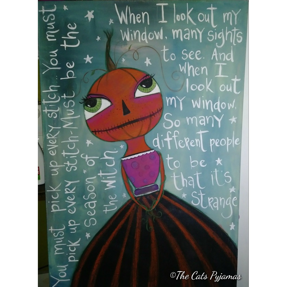 Mixed media Halloween painting using a combination of acrylics, oil pastels, watercolors and colored pencils. I painted the background with blues and greens with a big eyed pumpkin head in her fanciest Halloween dress. Some of the lyrics from "Season of the Witch" are painted around her.