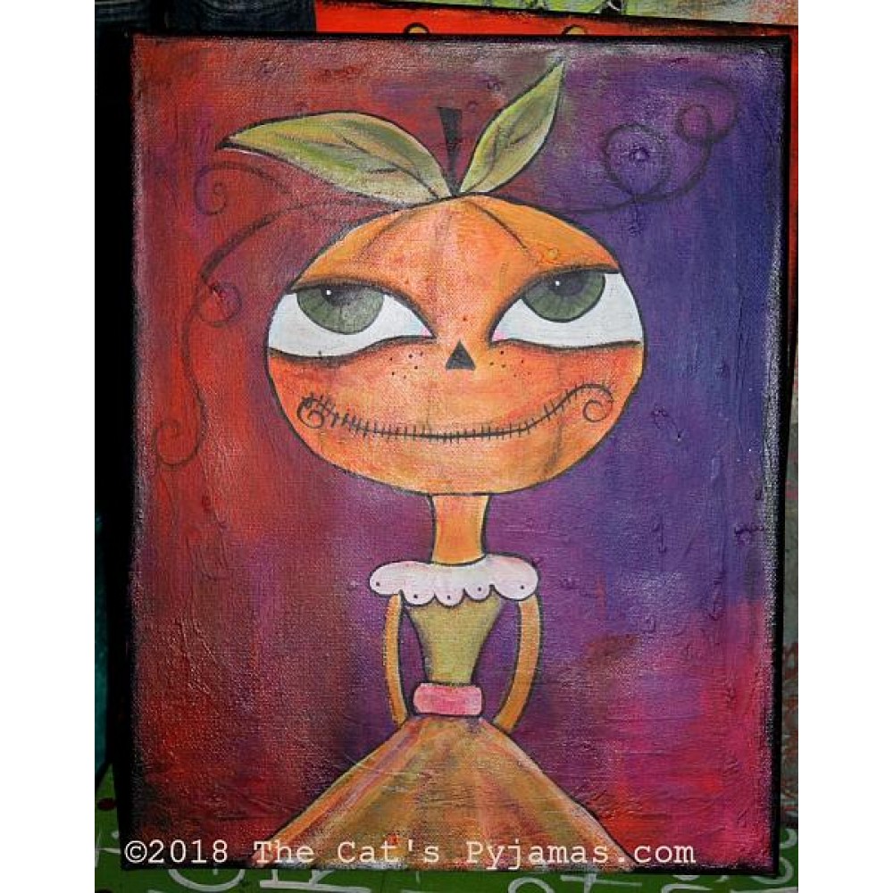 Background is a combination of reds, oranges & purples with a big-eyed pumpkin girl in the foreground