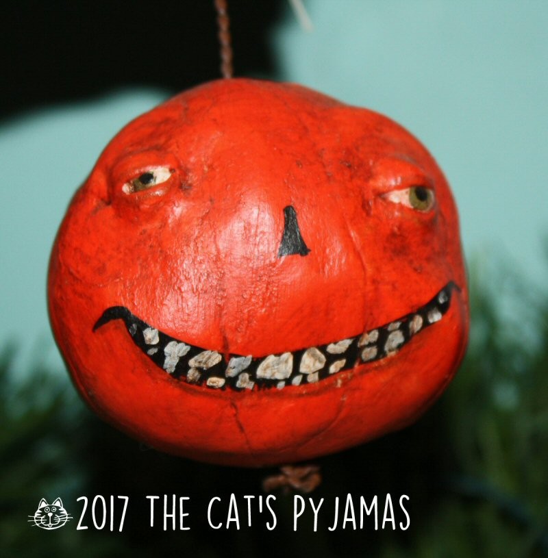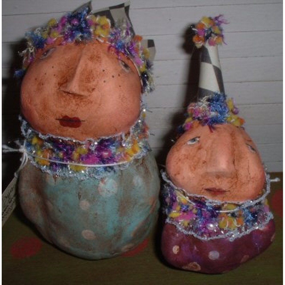 These party girls are both hand-sculpted from paperclay, hand-painted & antiqued. On the right is "party Girl". She measures about 4" tall to the top of her party hat! She has a checkerboard party hat and matching trim on her hat & around her neck.