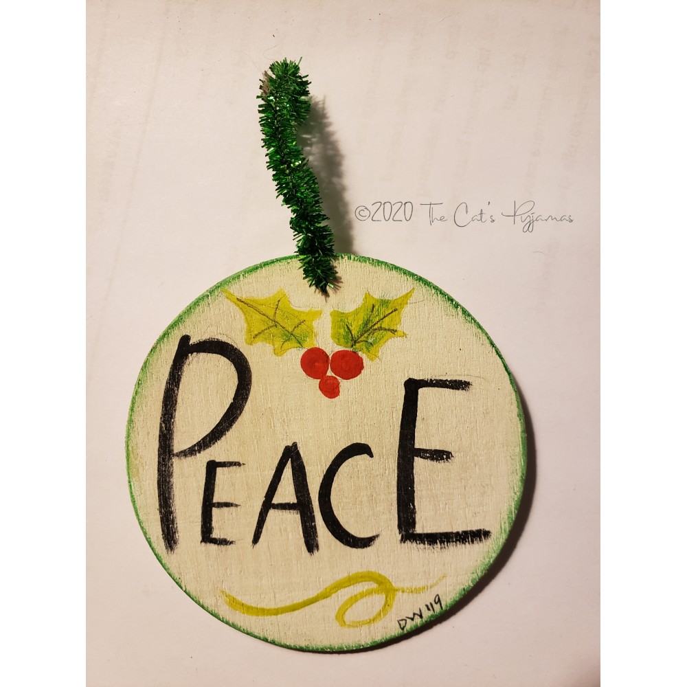Hand-painted ornament on wood with a vintage pipe cleaner hanger. 3.25"