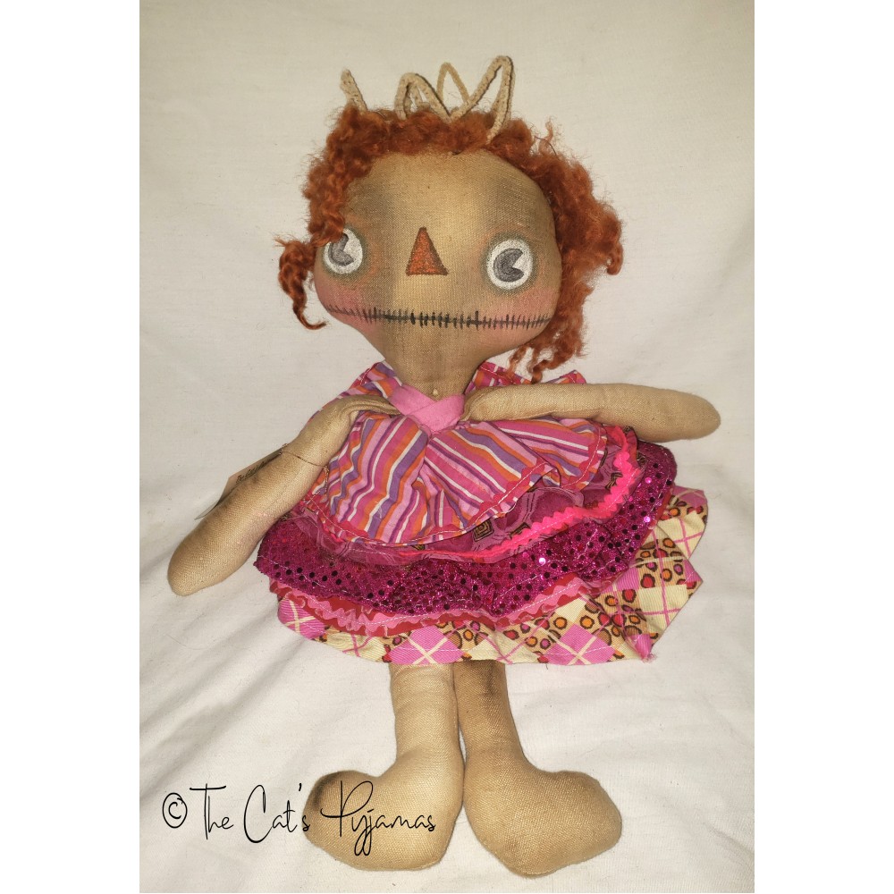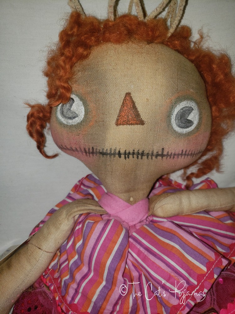 Princess Annie is made from stained fabric with hand-painted features. Her hair is made of dyed wool and she's wearing a tiara made from vintage pipe cleaners. Her dress is made of 6 different layers of fabrics in pinks and whites, including a leopard print, sequins, a sheer layer with pink rick rack, one red layer with pink hearts and pink rick rack, and a layer of lace on the very bottom. She's very feminine and her dress is over the top!