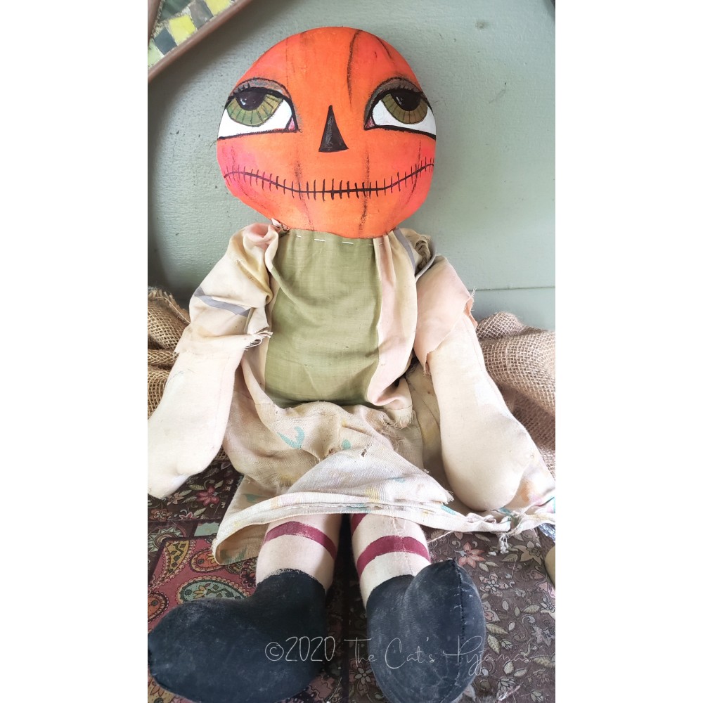 Punkin Patty used to be a Raggedy Ann doll in her former life! I made her in 2004 and just gave her a makeover in 2020! Her pretty pumpkin face is hand-painted and she's wearing a dress made from a very old quilt top. She's about 20.5" tall and I'm pretty sure she loves her new persona!