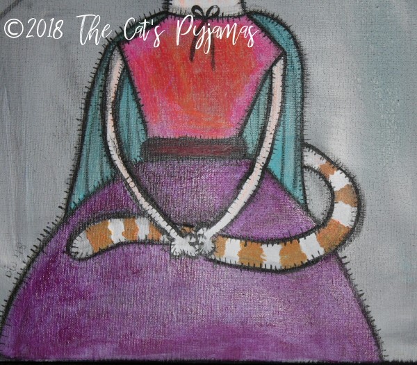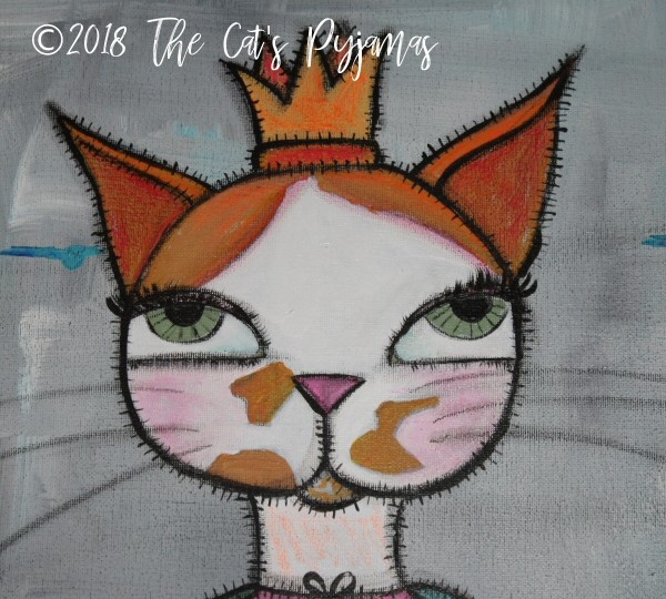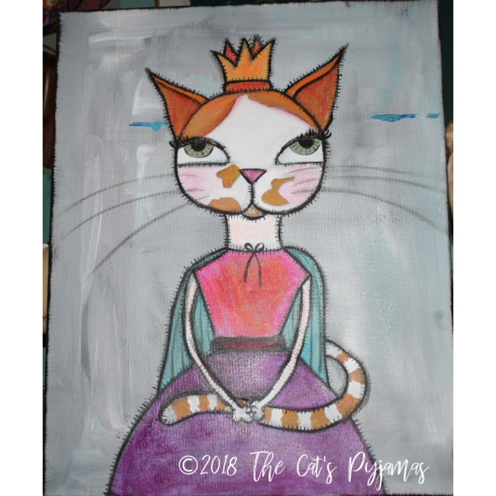 My kitty, Rosie, was the inspiration for this painting! I love the little patches of orange all over her face so I gave them to this princess kitty. She's painted on wrapped canvas with a mottled gray background. Naturally, she has a crown and a fancy dress and she's holding her striped tail. I used a combination or acrylic paints, watercolors, oil pastels and colored pencil and I used lots of bright colors.