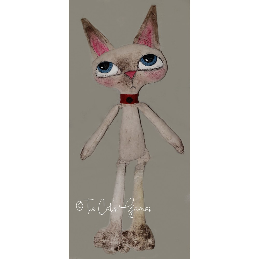 Siamese cat doll made of painted fabric with big blue eyes, a red felt collar, and a rusty bell. She's about 15.5" tall.