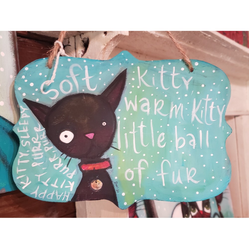 Hand-painted and hand-lettered sign on wood with a sisal hanger.