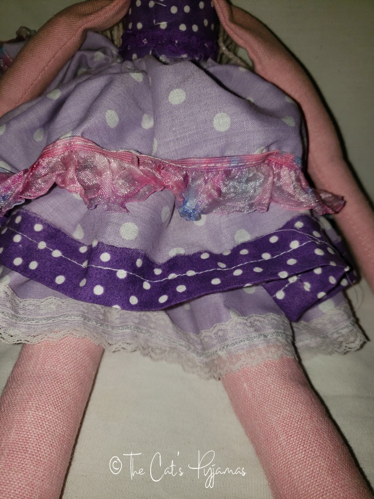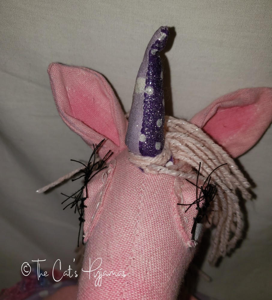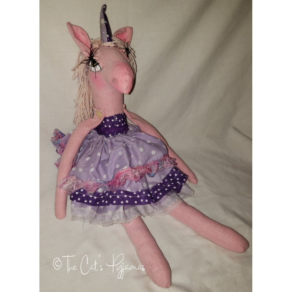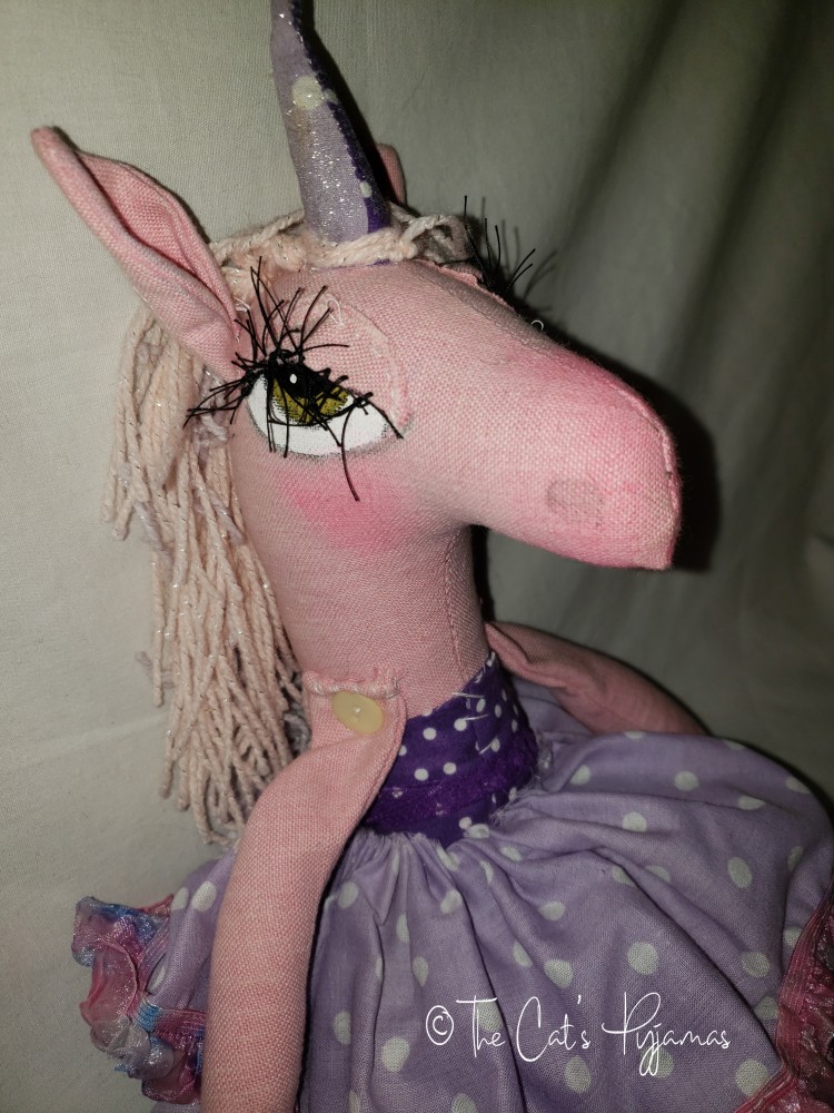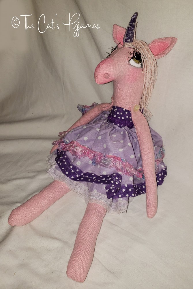 Made of pink fabric with painted eyes, eyelids with long lashes, and a sparkly horn. Her arms are attached with buttons and her hair is made of pink and gray ombre yarn. Her dress is made from purple and white polka dot fabrics, lace, and ruffles. She's about 22" tall.