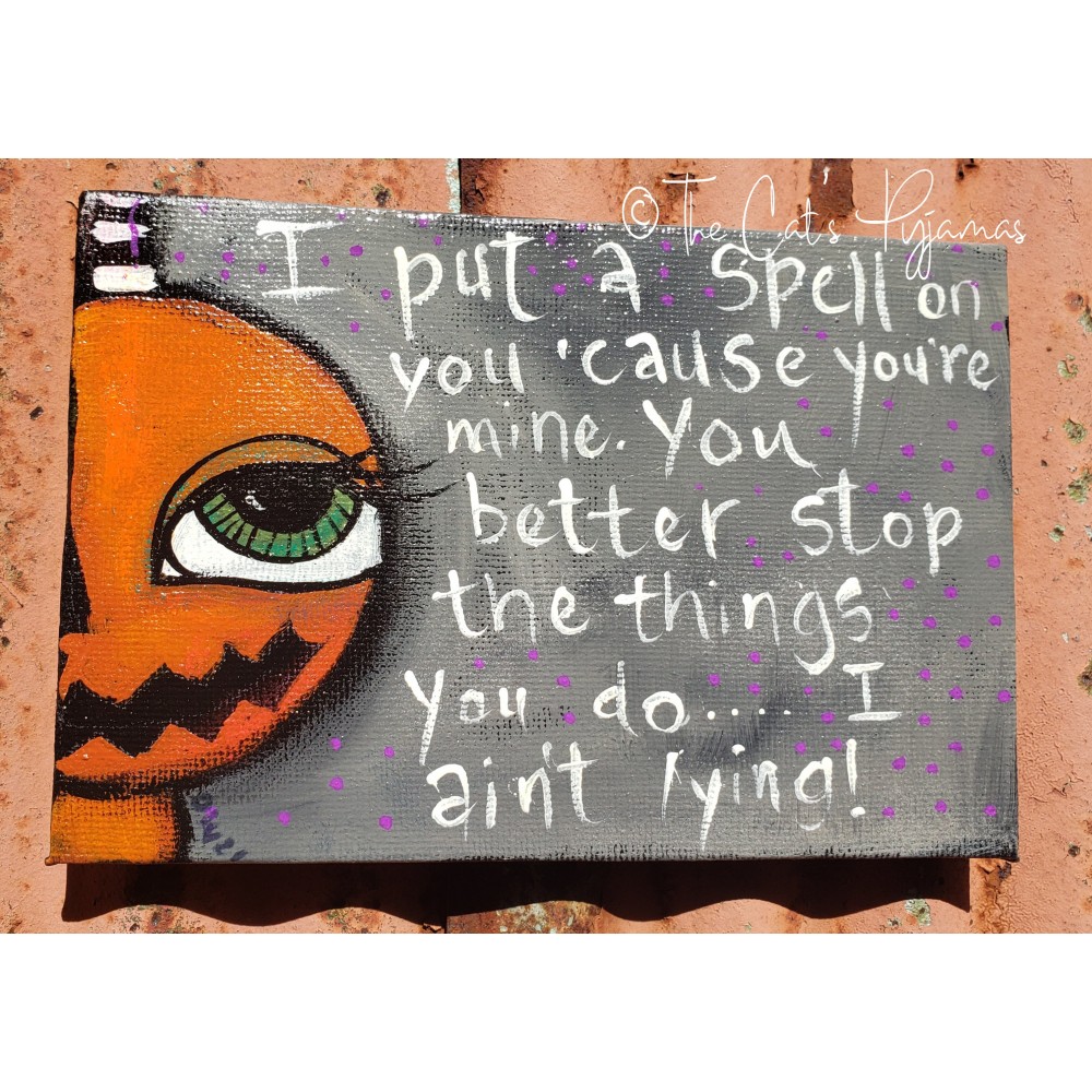 Mixed media painting of a pumpkinhead in a witch hat. I added some Nightmare Before Christmas lyrics (This is Halloween). Painted on an 4x6" stretched canvas using a combination of acrylics, oil pastels, charcoal, colored pencils, and watercolors.