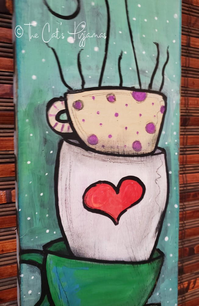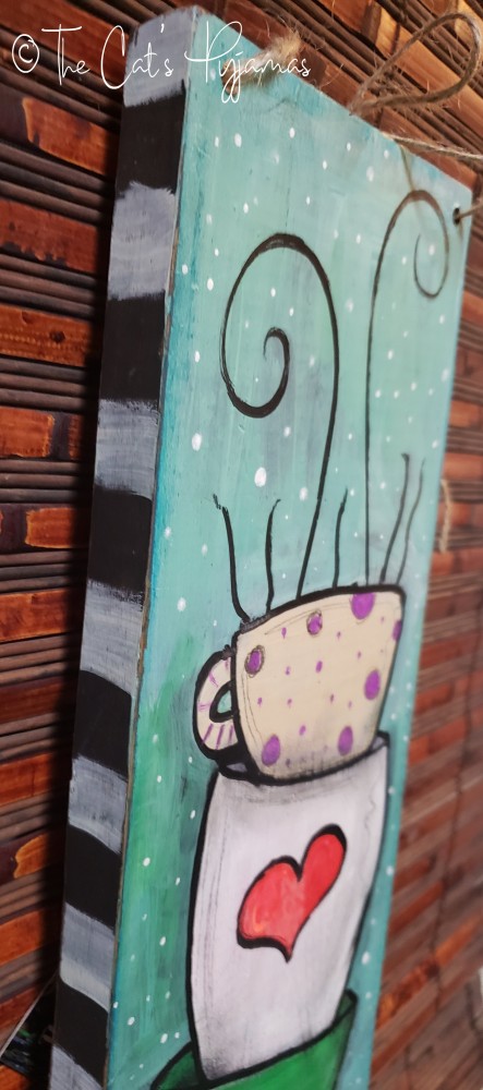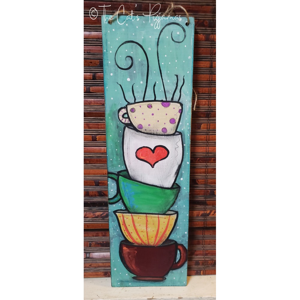 Mixed media painting on reclaimed wood. I used a combination of acrylic paints, watercolors, oil pastels, colored pencils, and lots of bright colors.