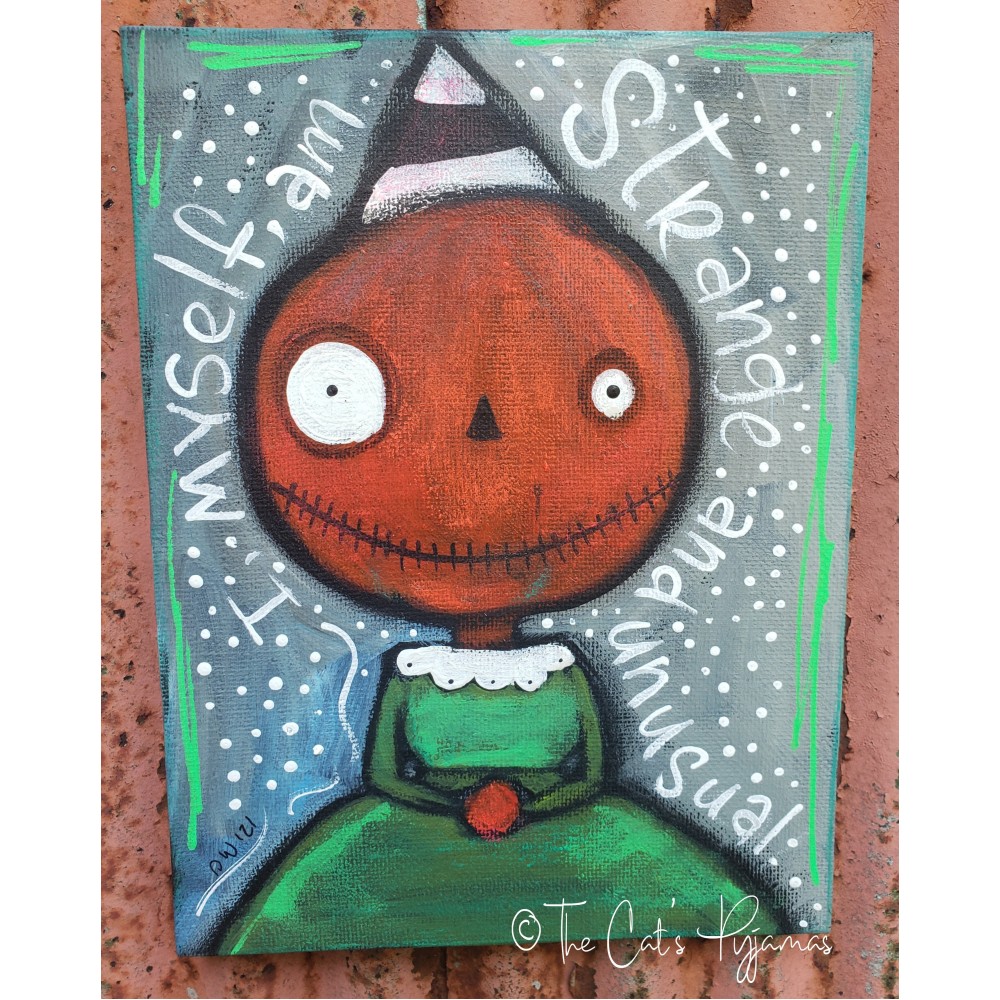 Painted on a 6" x 8" stretched canvas using a combination of acrylics, watercolors, colored pencil, and oil pastels. I painted a Pumpkinhead in a party hat and hand-lettered the quote, "I, myself, am strange and unusual." -- Lydia Deetz, Beetlejuice