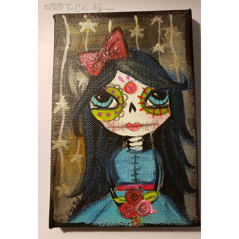 Tags: Halloween, sugar skull, day of the dead, Mexican, dia de los Muertos, DOD, black hair, big eyes, blue eyes