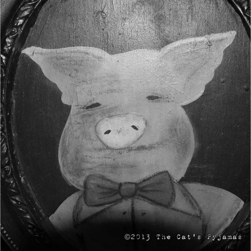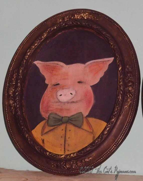 This is my portrait of one of the 3 Little Pigs. The three little pigs would go great together, along with the big bad wolf.. They will be listed separately. I found these oval frames at a thrift store and grabbed them up because I knew I wanted to do some portraits of some fairy tale characters! They were an ugly putty color, but I painted them dark brown with a gold over that to give a gold leaf look. The frames seem to be hand made, poured into a mold, so they aren't perfect, but I think that adds to the old look. I painted the this little pig with acrylics & oil pastels. I did a little bit of a crackle finish, but it is subtle and you may not see it in the photos. After that, I antiqued it and hopefully it reminds you of an old portrait that would be hanging on someone's wall.In case you didn't know, this is the little pig that built his house out of BRICK! I noticed the frame looks funny in this picture, but it is oval and shaped the same as the others!