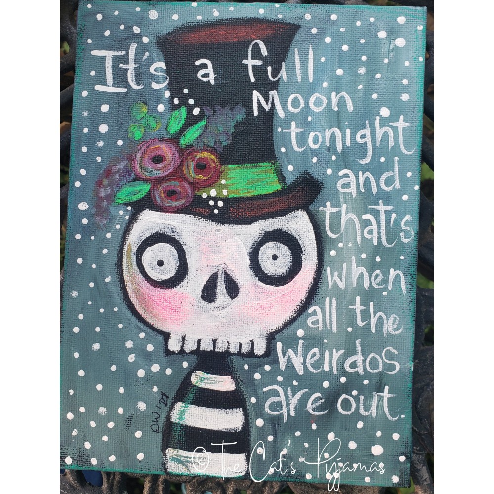 Painted on a 6" x 8" stretched canvas using a combination of acrylics, watercolors, colored pencil, and oil pastels. I painted a skeleton in a top hat and hand-lettered the quote, "It's a full moon tonight and that's when all the weirdos come out." - Dani, Hocus Pocus