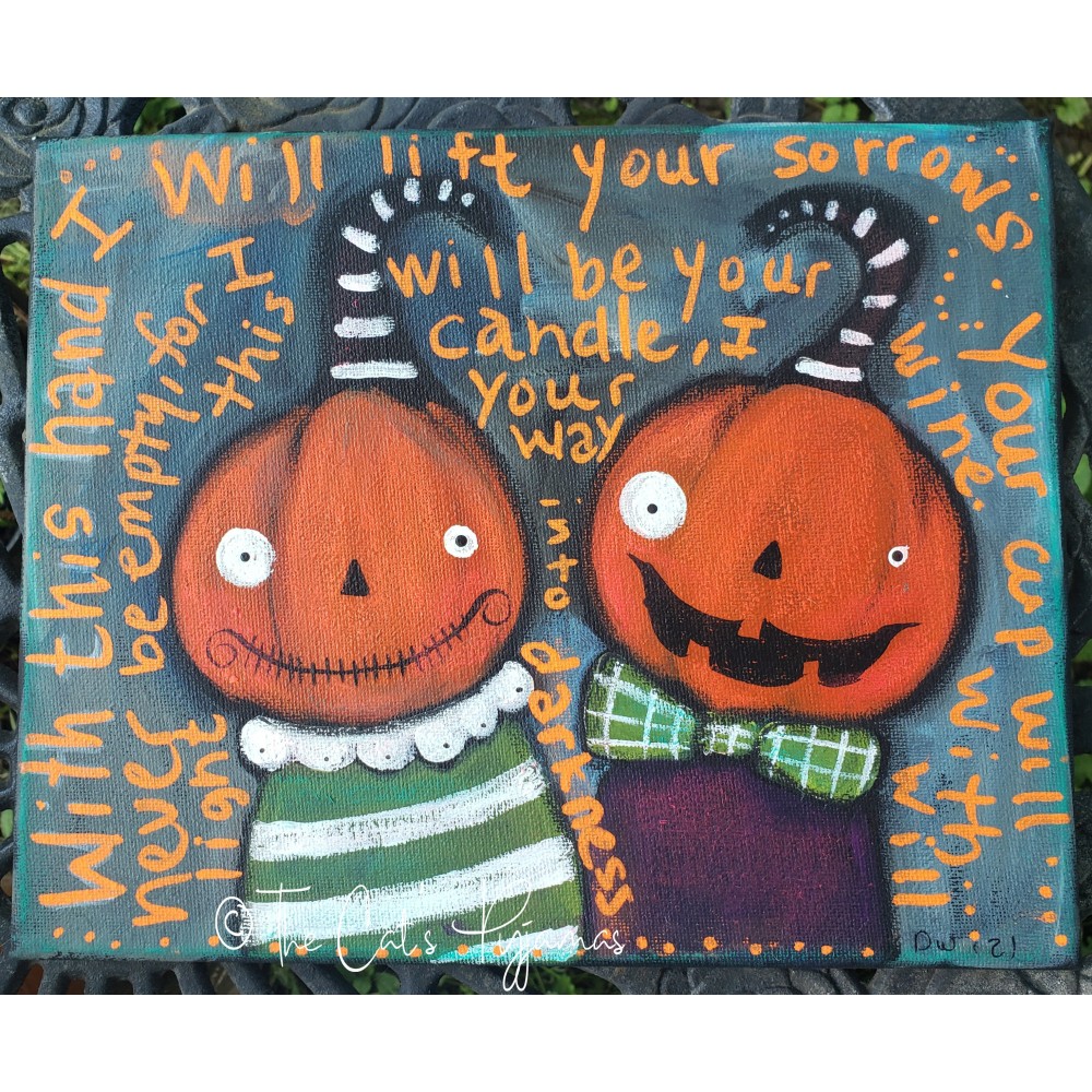 Painted on an 8" x 10" stretched canvas using a combination of acrylics, watercolors, colored pencil, and oil pastels. I painted a cute Jack-o-lantern couple and hand-lettered the quote, "With this hand, I will lift your sorrows. Your cup will never be empty, for I will be your wine. With this candle, I will light your way into darkness. with this ring, I ask you to be mine." - Victor Van Dort, The Corpse Bride