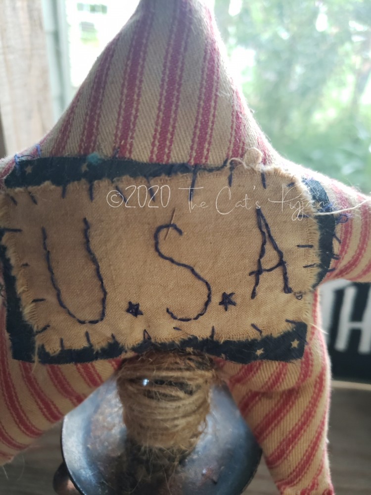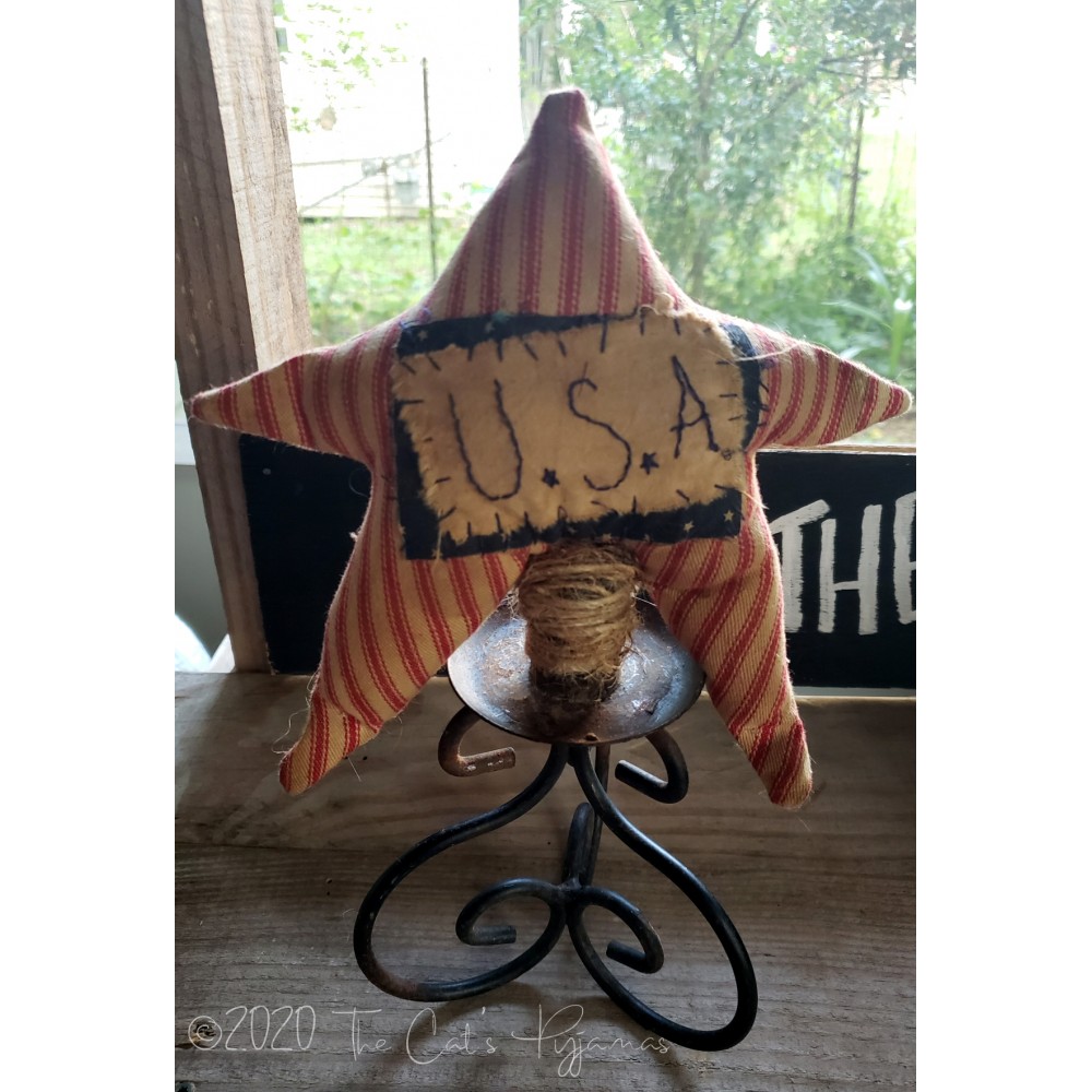 Cloth primtiive star with hand-stitched letters on a vintage candle holder for a base.