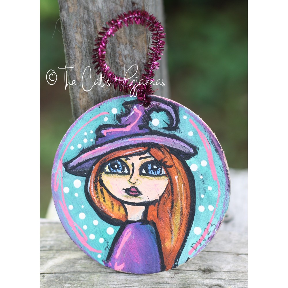Mixed media painted ornament on wood, a little over 3" across with a sparkly hanger